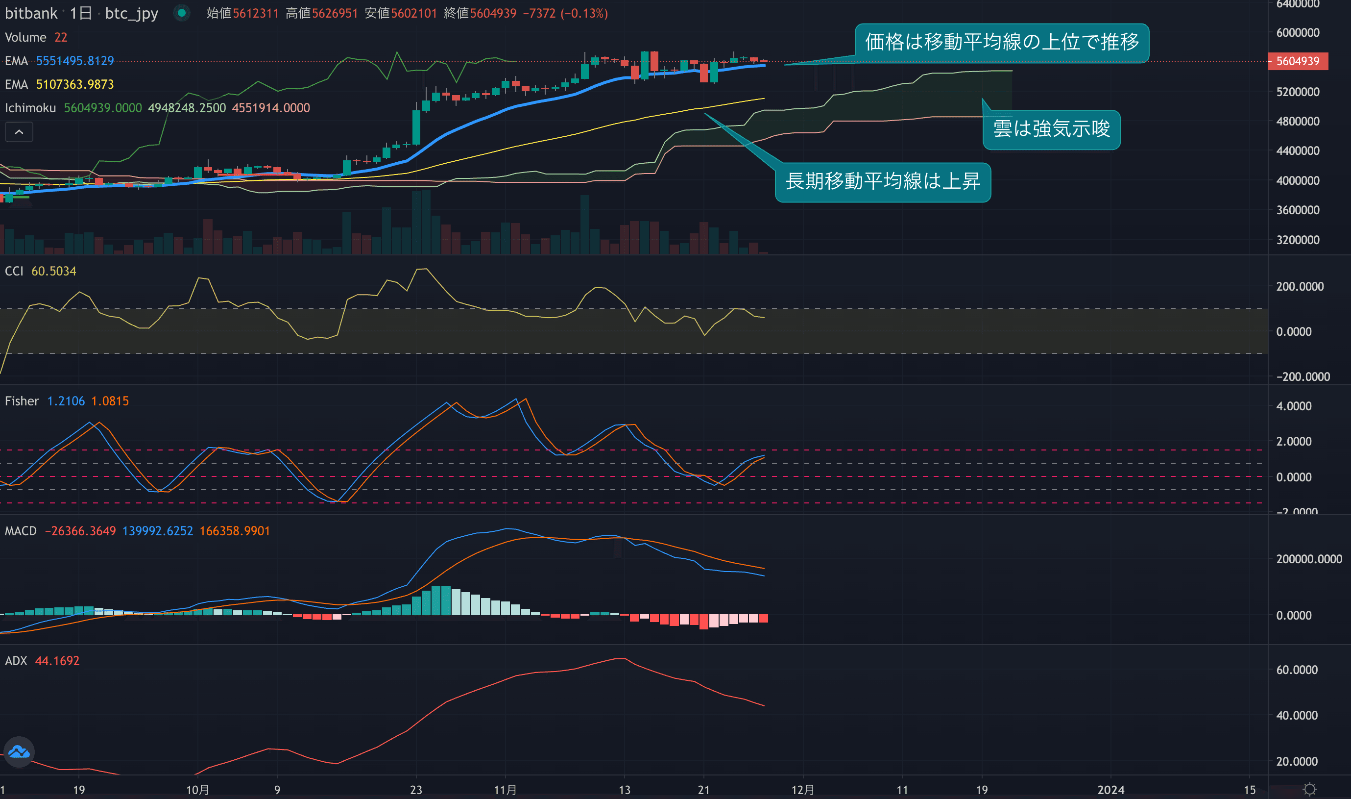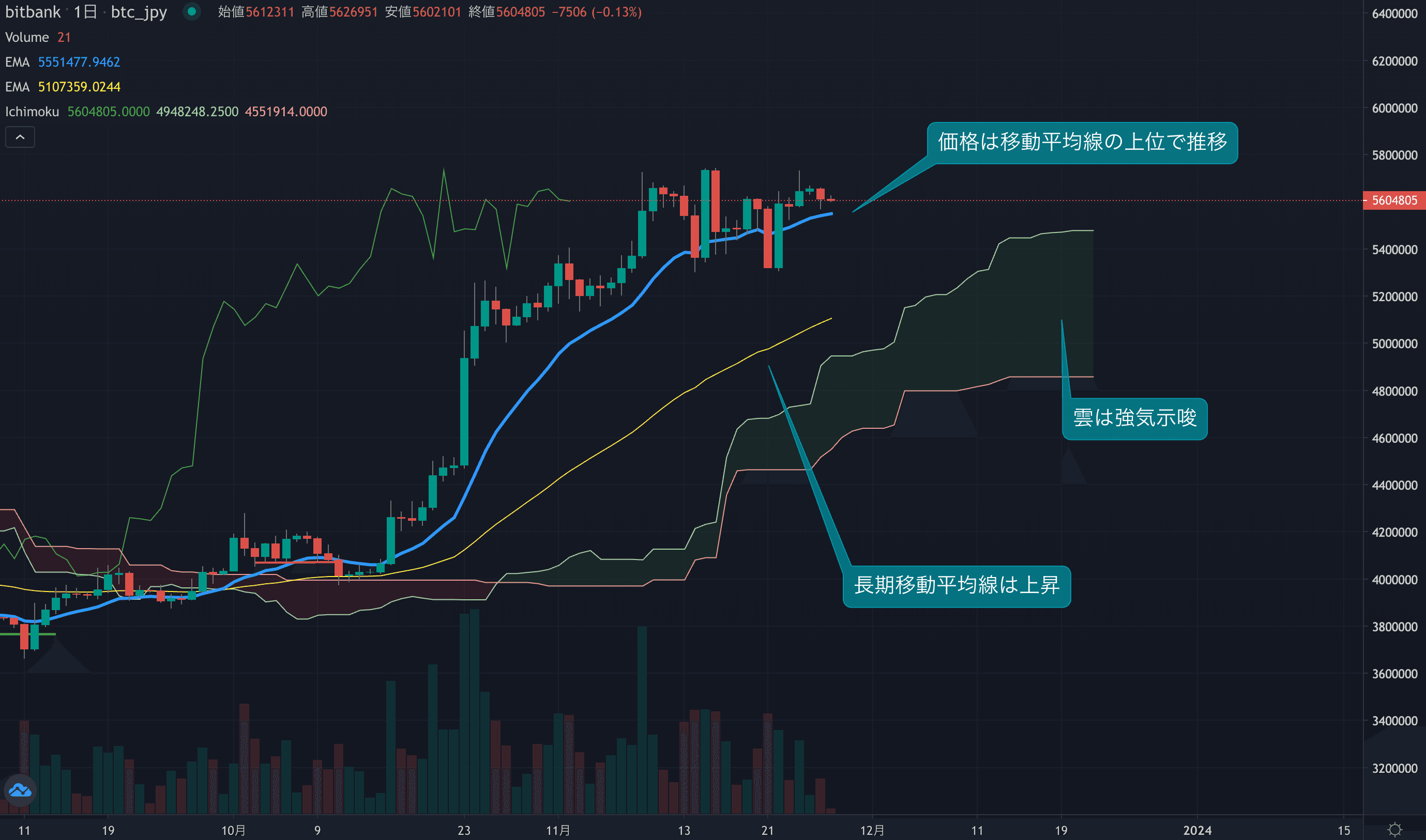 - 価格は14EMA(554.3万円)を上回り強気示唆です。53EMA(508.8万円)は上昇しており、長期トレンドも強気です。一目均衡表の雲は先行スパン1(548.0万円)が先行スパン2(485.9万円)を上回り強気示唆です。