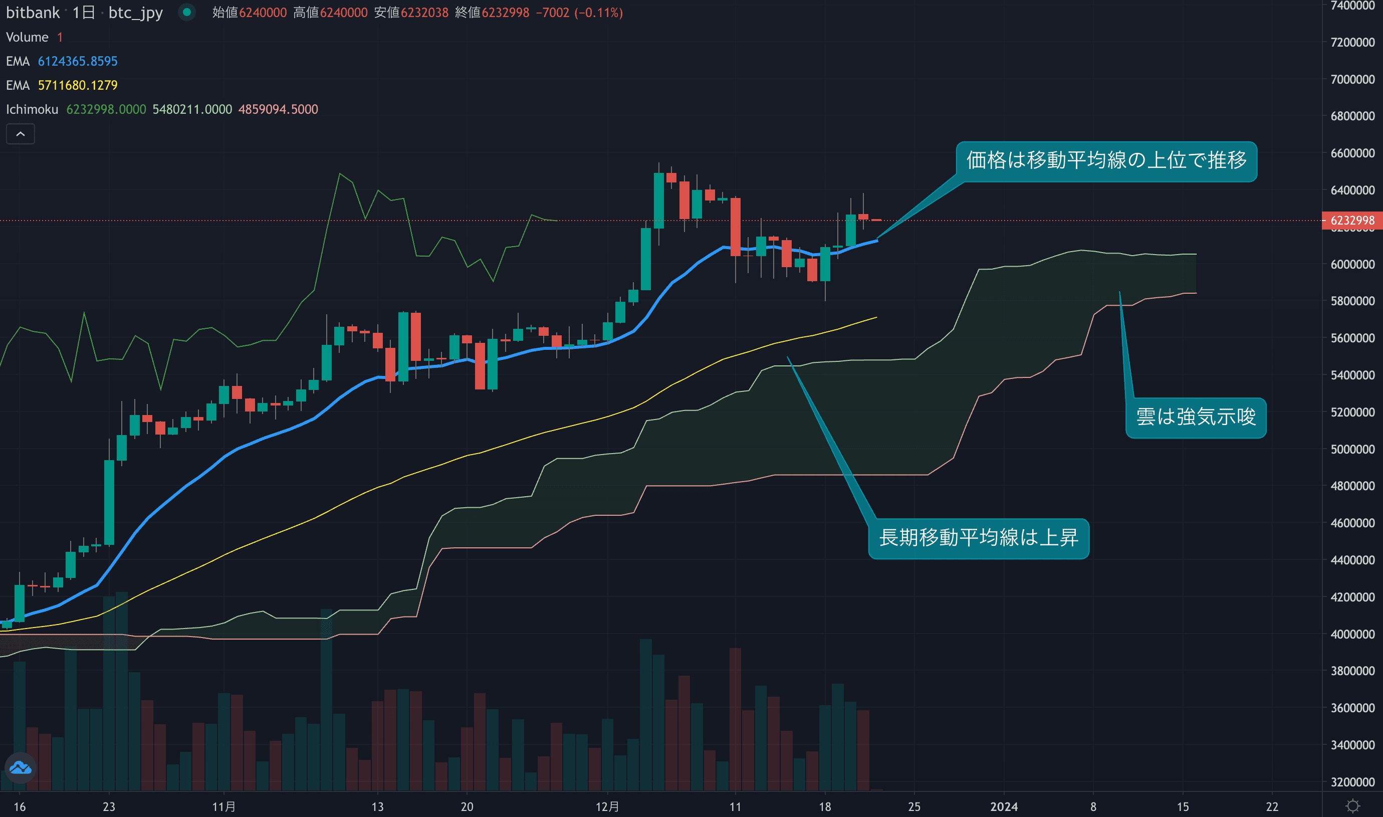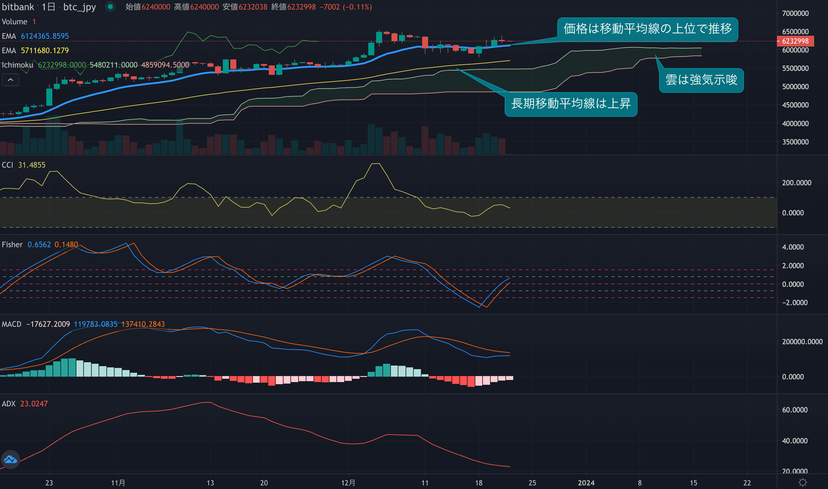 - 価格は14EMA(610.7万円)を上回り強気示唆です。53EMA(569.1万円)は上昇しており、長期トレンドは強気です。一目均衡表の雲は先行スパン1(605.3万円)が先行スパン2(584.1万円)を上回り強気示唆です。