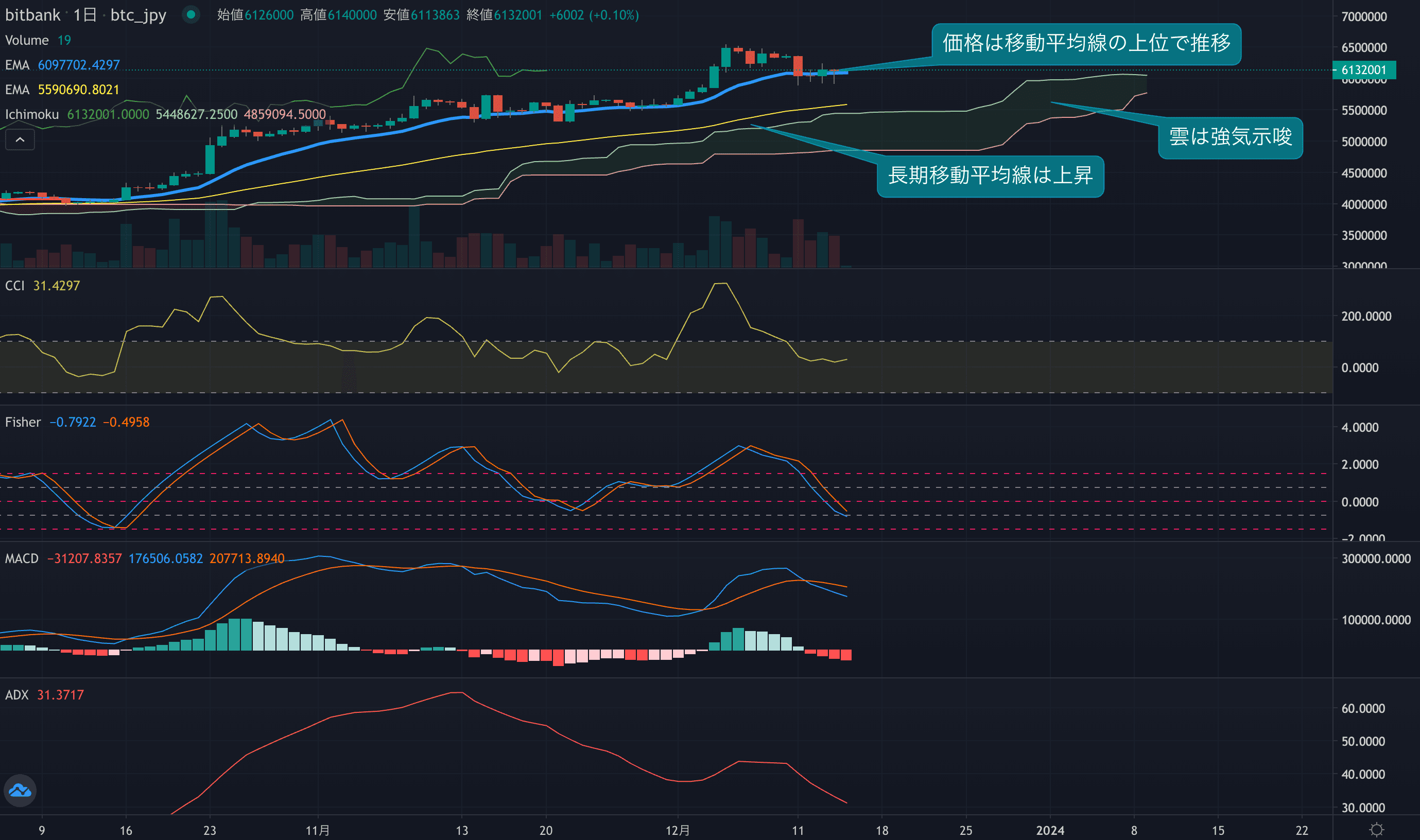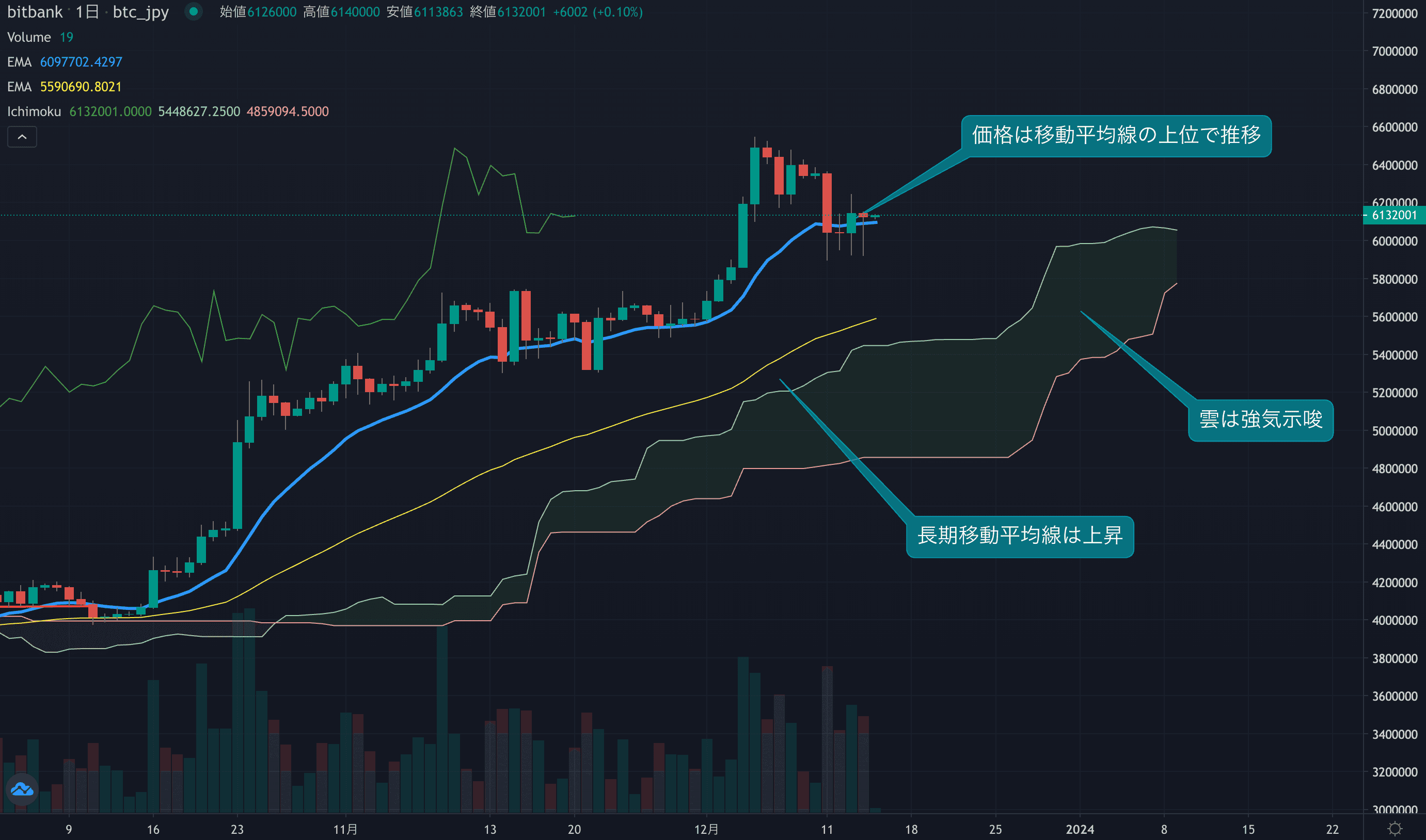 - 価格は14EMA(609.2万円)を下回り弱気示唆です。53EMA(556.9万円)は上昇しており、長期トレンドは強気です。一目均衡表の雲は先行スパン1(606.8万円)が先行スパン2(572.6万円)を上回り強気示唆です。