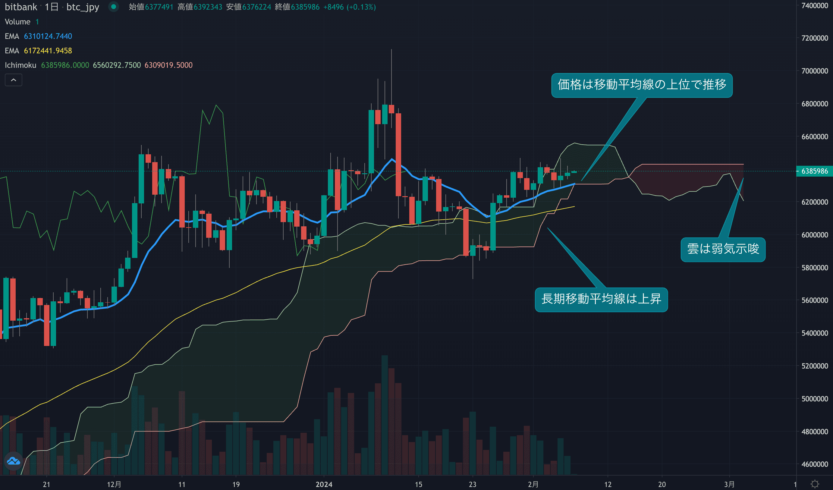 - 価格は14EMA(629.8万円)を上回り強気示唆です。53EMA(616.4万円)は上昇しており、長期トレンドも強気です。一目均衡表の雲は先行スパン1(628.4万円)が先行スパン2(643.0万円)を下回り弱気示唆です。
