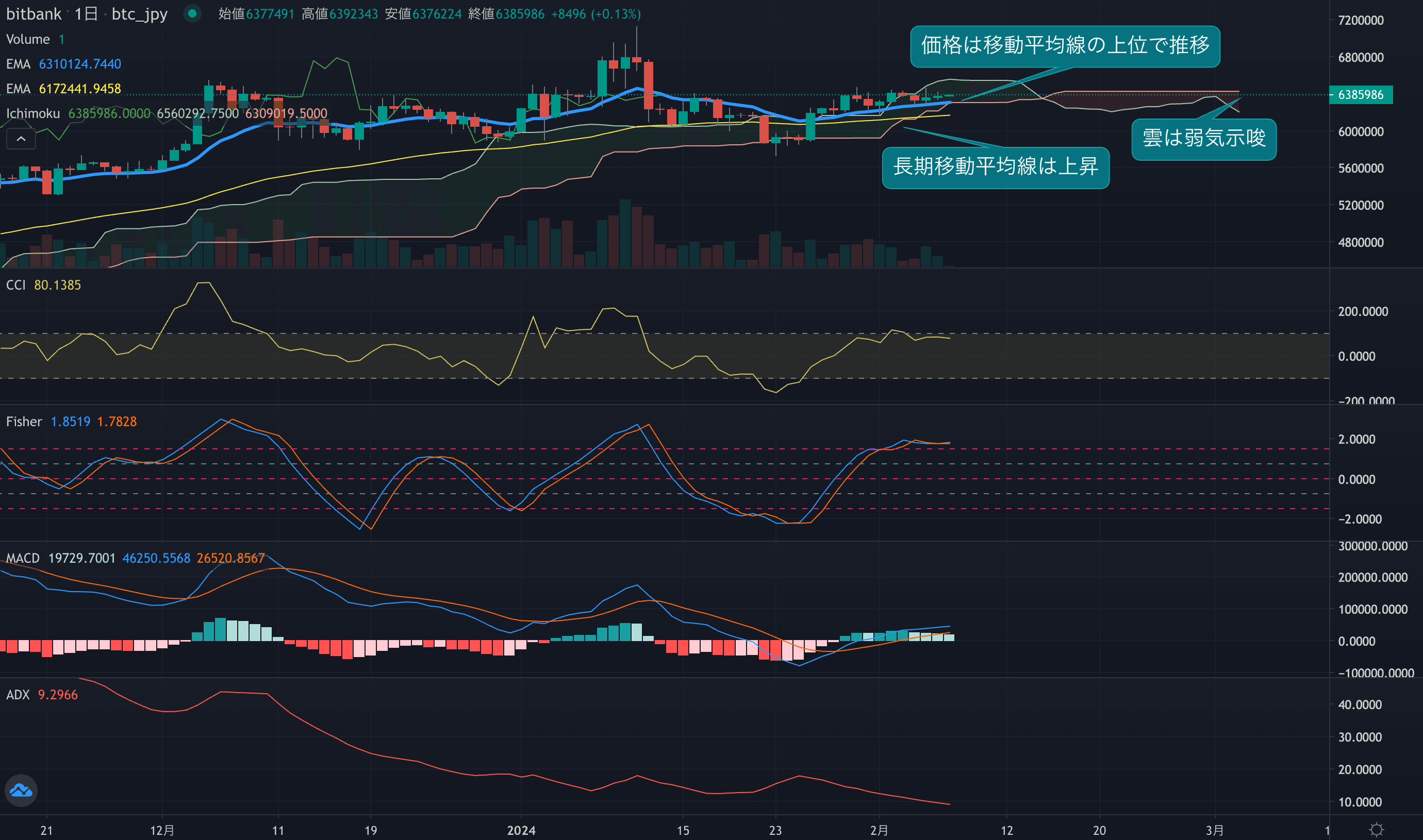 - オシレーターはプラスで推移し、上昇するものが多い状態です。CCIは86まで上昇。Fisherは本日からゴールデンクロスが発生しています。長期オシレーターのMACDはプラス圏で遅行線を上回り推移しています。