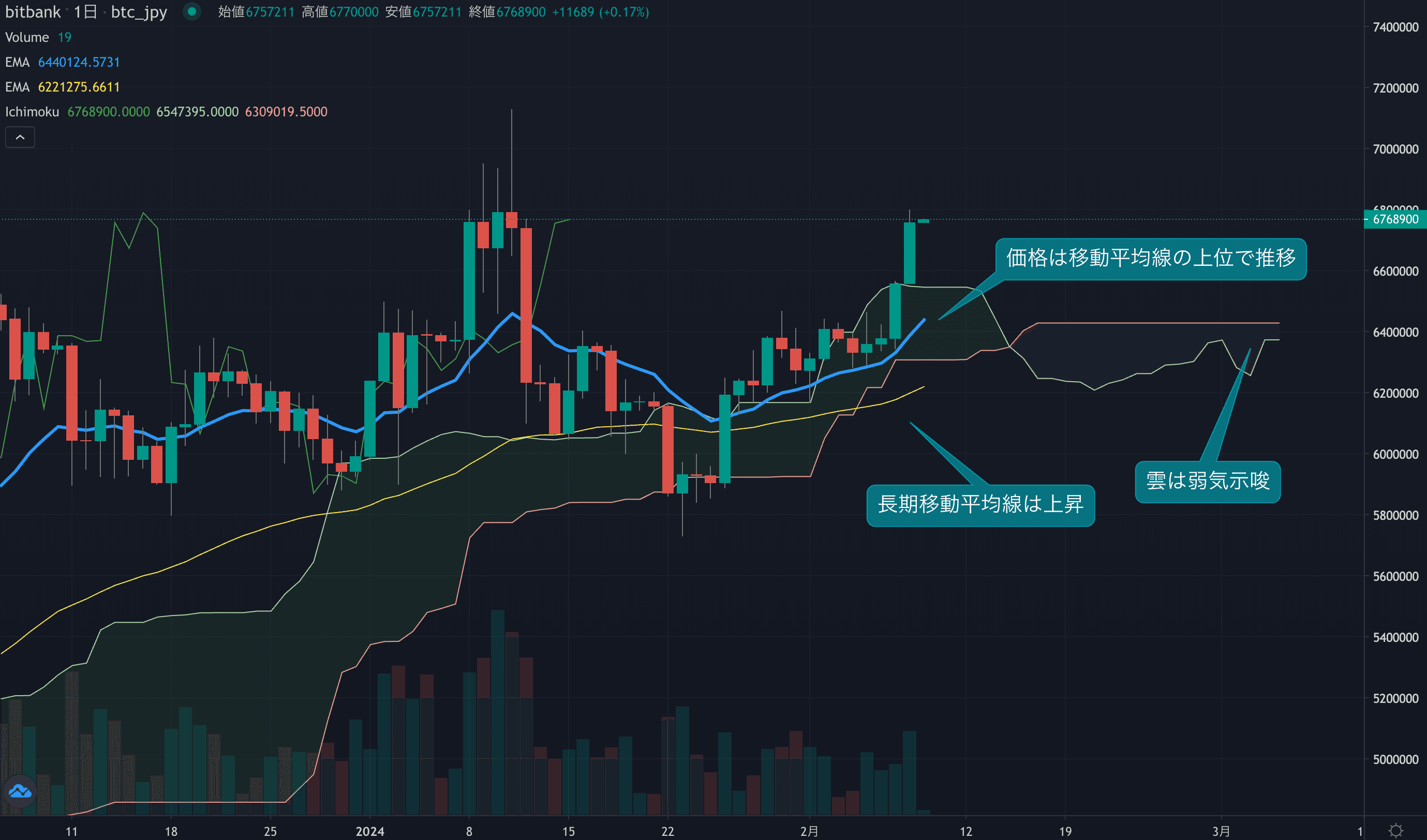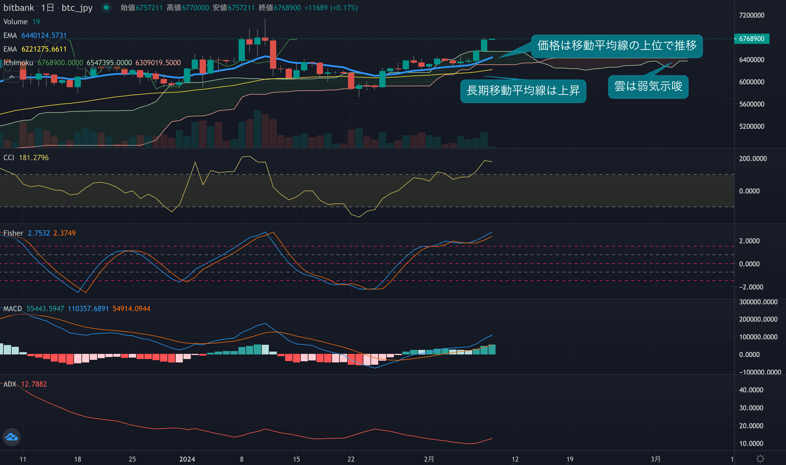 - 昨日のビットコインは3.0%上昇し、終値は675.7万円でした。今週は買いが先行する相場となっており、4日連続の陽線を記録しています。1月初旬の高値圏まで値を戻しており、強気の動きとなっています。
