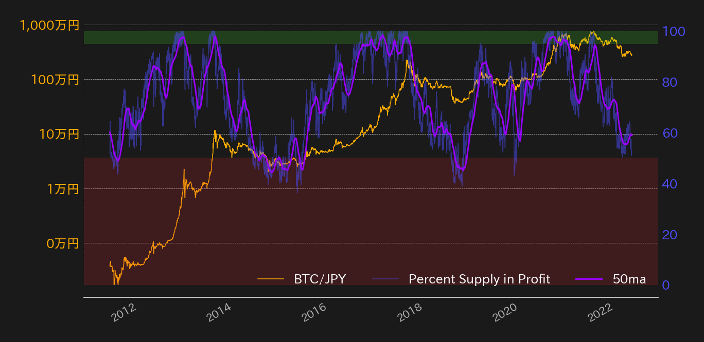 また、大局的なトレンドにおいてオシレーターとして機能してきたオンチェーン指標の黒字コイン割合(Percent Suppy in Profit)も、6月中旬ぶりに売られ過ぎ水準となる50%に迫っており、相場の下値余地が限定的と言える上に、足元より低い相場水準では押し目買いが入りやすいだろう。6月中旬に同指標が50%に肉薄すると、相場は下げ止まりに転じていた。