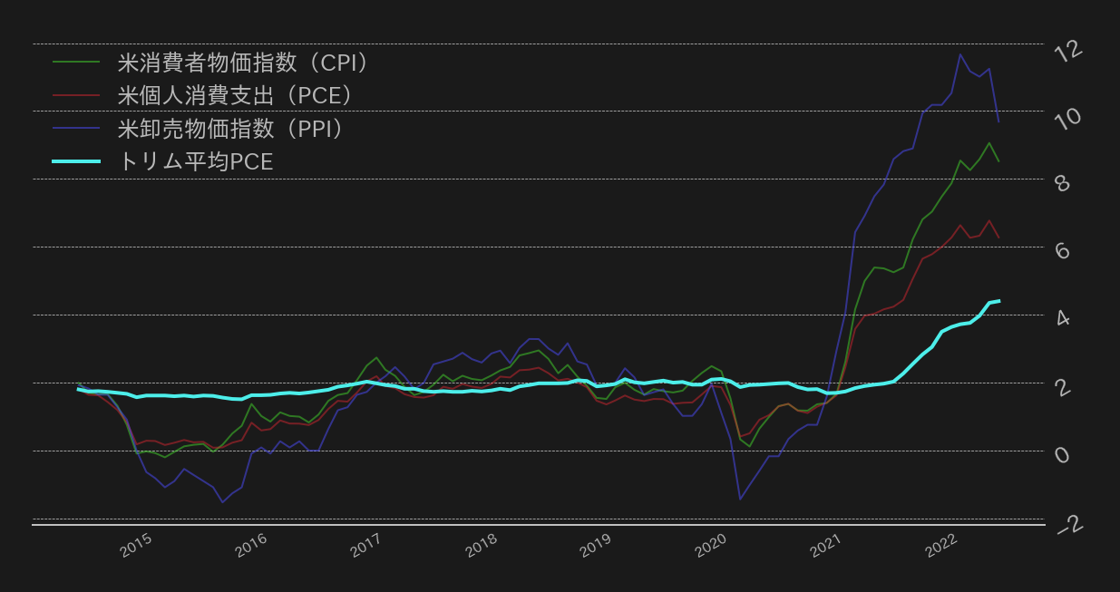 ジャクソンホールでのパウエル議長講演と日程が被り存在感が薄れたが、同日には7月の米個人消費支出(PCE)も発表された。結果は前年同月比で6.8%から6.3%の低下で、CPIとPPIの流れを汲んだ。インフレが減速すれば金融引き締めもペースダウンし得るが、問題は中長期的なトレンドを示す指標だ。幅広い商品項目の物価を計測するインフレ統計はどうしてもノイズが入ることが多々あり、トレンドを見誤る恐れがある。そこで参考にされるのが、ダラス連銀が算出するトリム平均PCEインフレ率(以後トリム平均PCE)だ。同指標はPCEから上下に物価変動の激しい項目を排除して算出され、短期的なノイズを抑える役割を果たす。