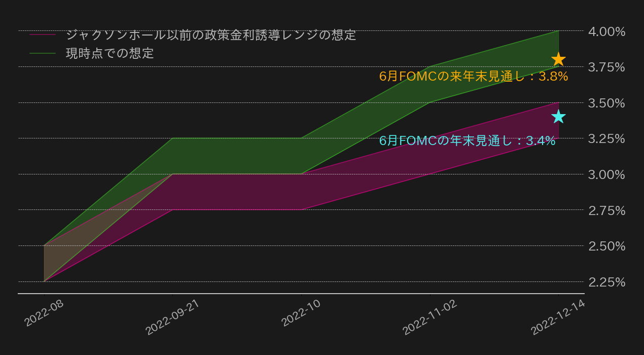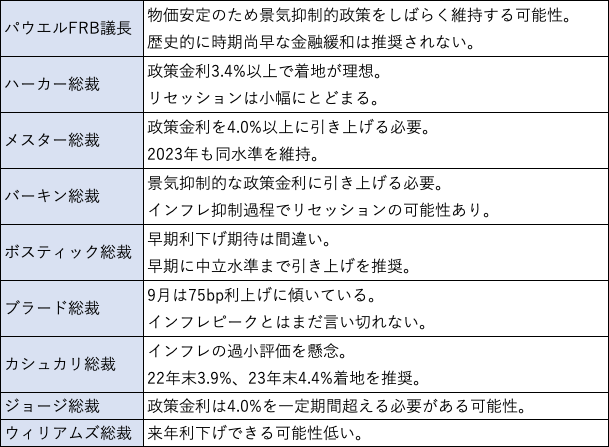 勿論、大幅な利上げを前倒し(フロントローディング)にして早期に利上げを終わらせるシナリオも以前では考えることができたが、パウエル議長やボスティック総裁、ウィリアムズ総裁のように早期の緩和に警鐘を鳴らすFRB関係者は一定数おり、9月のFOMCでも利上げサイクルの出口を探るヒントは乏しいと指摘される。