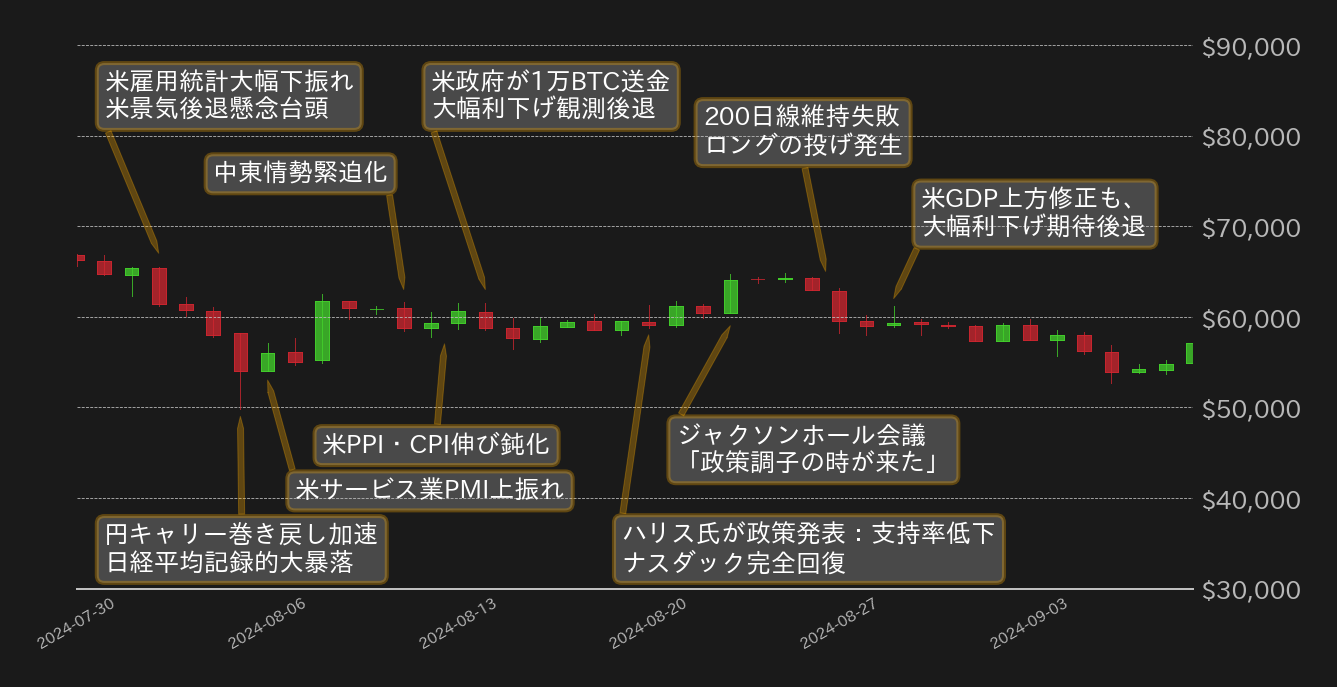 7月の米雇用統計が弱かったことで、景気後退懸念の台頭と共にFF金利先物市場では9月のFOMCでFRBが50ベーシスポイント(50bp)と大幅な利下げを決定する可能性が急速に織り込まれた。一方、その後発表されたサービス業PMI、小売売上高、さらにはGDP成長率といったデータが強めに出たことで、景気後退に対する懸念は落ち着いていったものの、大幅利下げ観測に修正が入り、BTCにとっては方向感を示しづらい状況となった。