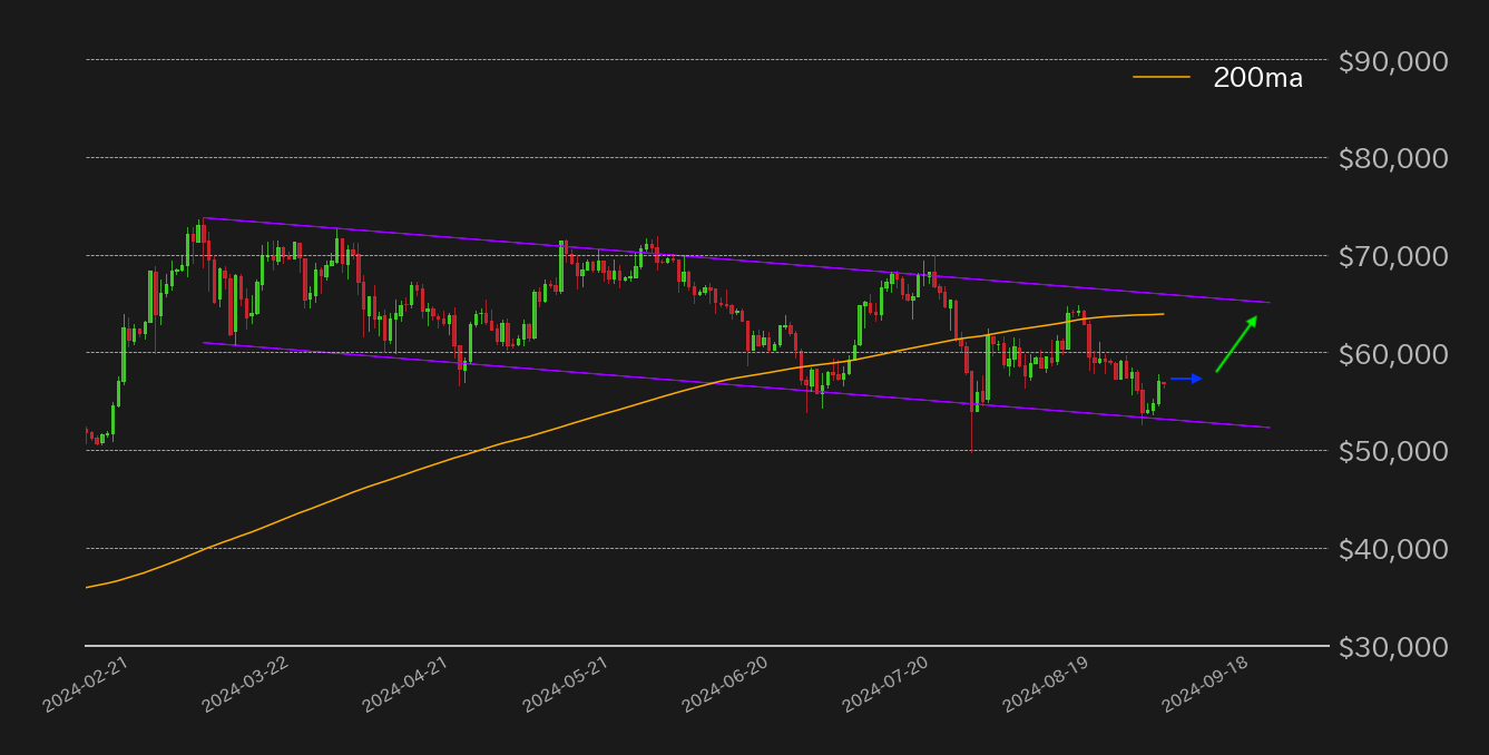 尚、9月6日に発表された8月の米雇用統計を受けて相場は一時下落、下降チャネル下抜けには失敗したものの、FOMCまでに65,000ドル付近まで相場が戻すには材料不足と指摘され、9月中のブレイクアウトはあまり現実的ではなさそうだ。