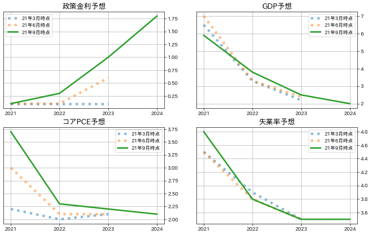 9月の経済見通しでは、21年末時点の国内総生産(GDP)見通しの引き下げや、失業率見通しの引き上げがされており、やはり目先の経済活動の減速が予想されています。一方で、21年以降ではGDP見通しは引き上げられ、失業率は6月の見通しから変わらずとなっており、足元のデルタ株の影響は一時的であるという見方が伺え、来年には政策金利の誘導目標を引き上げることができる状態になると予想されています。