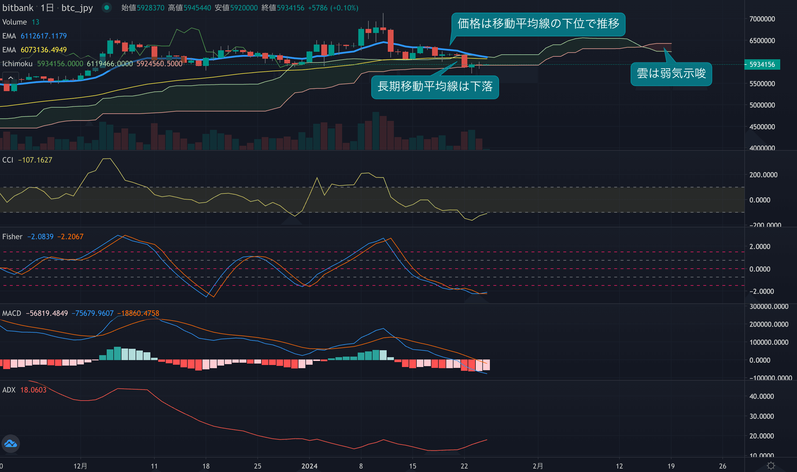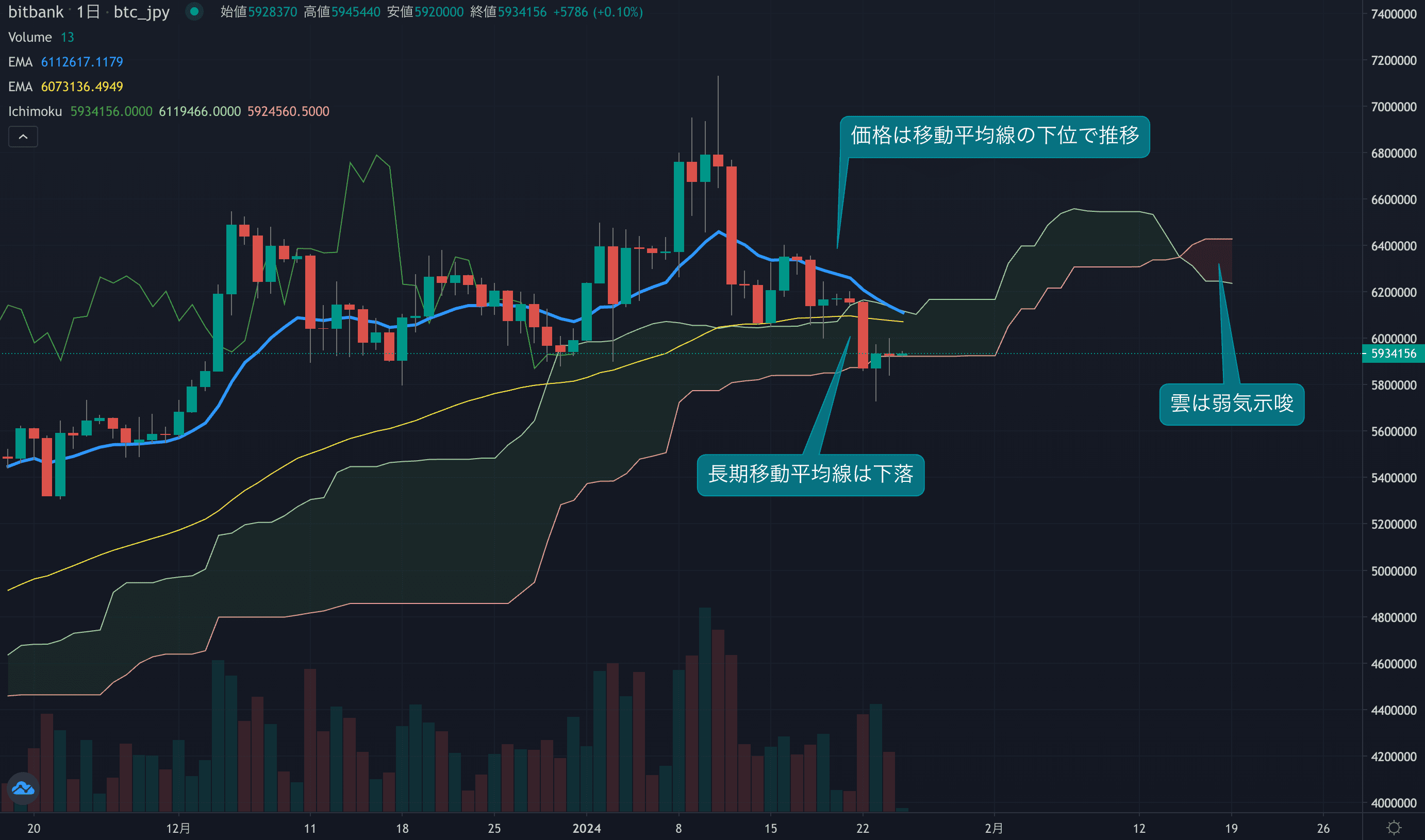 - 価格は14EMA(614.0万円)を下回り弱気示唆です。53EMA(607.8万円)は下落しており、長期トレンドも強気です。一目均衡表の雲は先行スパン1(624.8万円)が先行スパン2(643.0万円)を上回り強気示唆です。