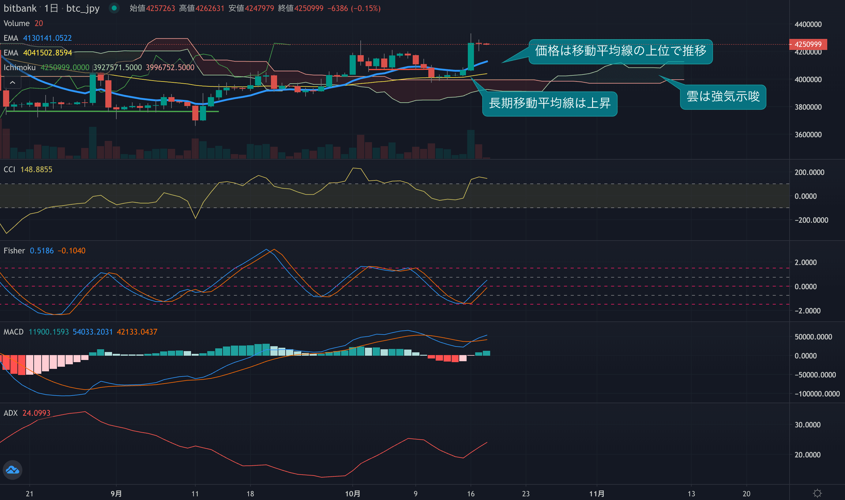 - オシレーターは足元で上昇傾向です。CCIは大きくプラスとなり161で推移。Fisherは足元で上昇し本日からプラスで推移しています。長期オシレーターのMACDは、昨日ゴールデンクロスを記録し、買いシグナルが出ています。