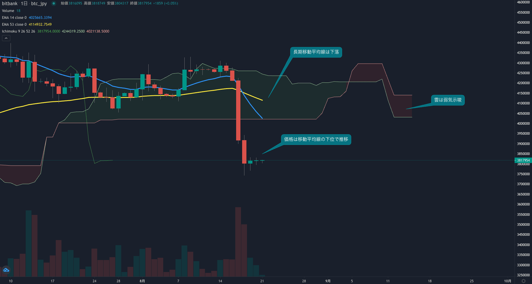 - 先週のビットコインは週次で10.3%のマイナスとなり、相場は大きく崩れました。ここ2ヶ月間は400万円の上位で推移していましたが、遂に価格が400万円台を割り込みました。今年の高値圏のレンジ相場から弱気トレンド相場へ移行しています。今後は反発があった際には上値が重くなり、売りポイントとして意識されるでしょう。
