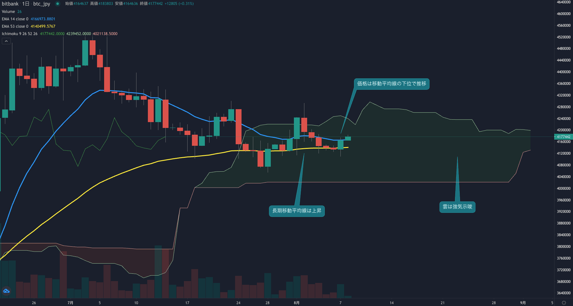 価格は14EMA(416.5万円)を僅かに下回り弱気示唆です。53EMA(413.9万円)は横ばい推移しており長期トレンドは中立です。一目均衡表の雲は先行スパン1(420.1万円)が先行スパン2(412.3万円)を上回り強気示唆です。