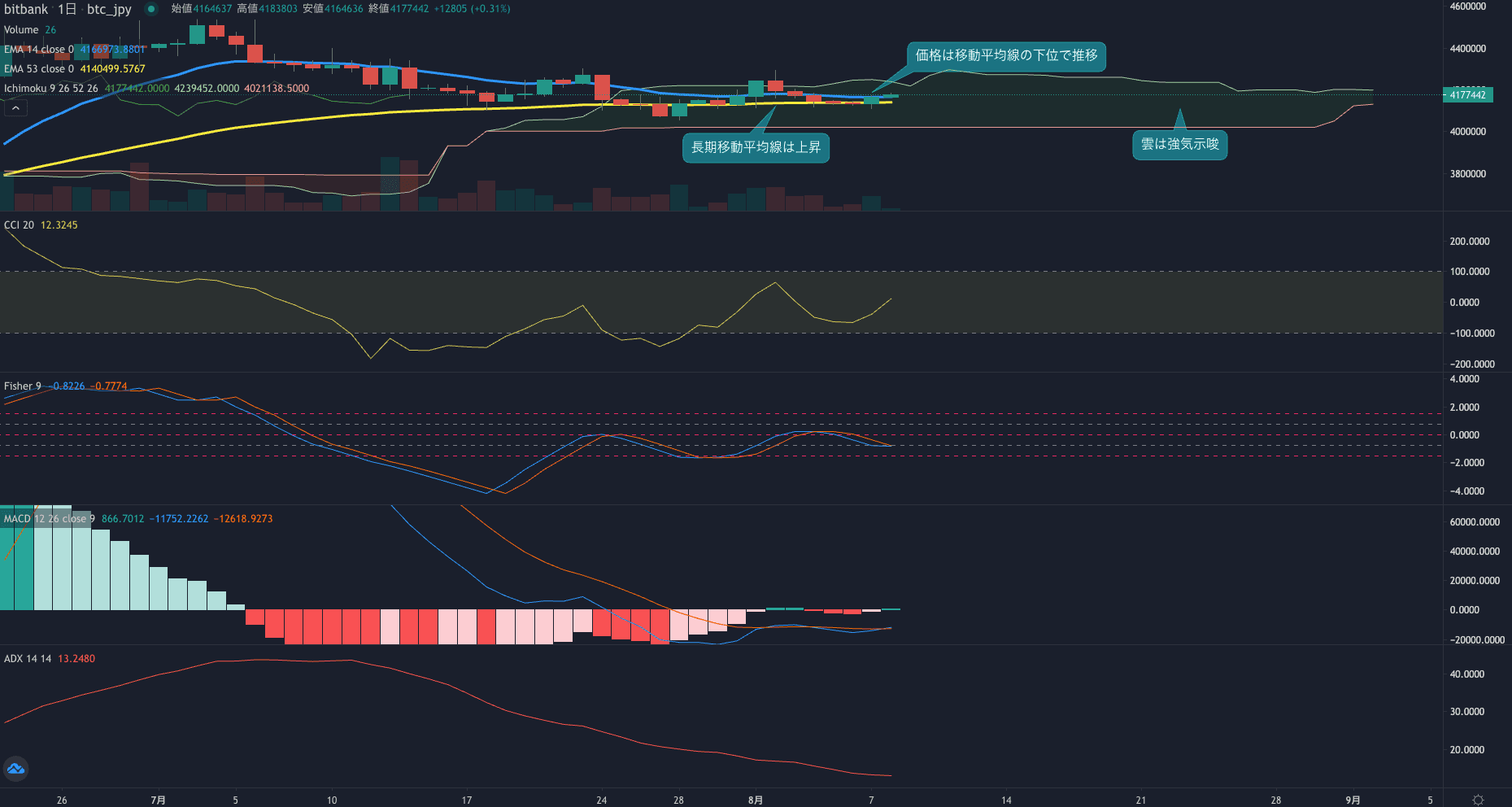 - オシレーターはマイナスで推移も反発の兆しがあります。CCIは本日からプラスで推移。Fisherもゴールデンクロスし始めています。MACDもマイナスで上昇しています。