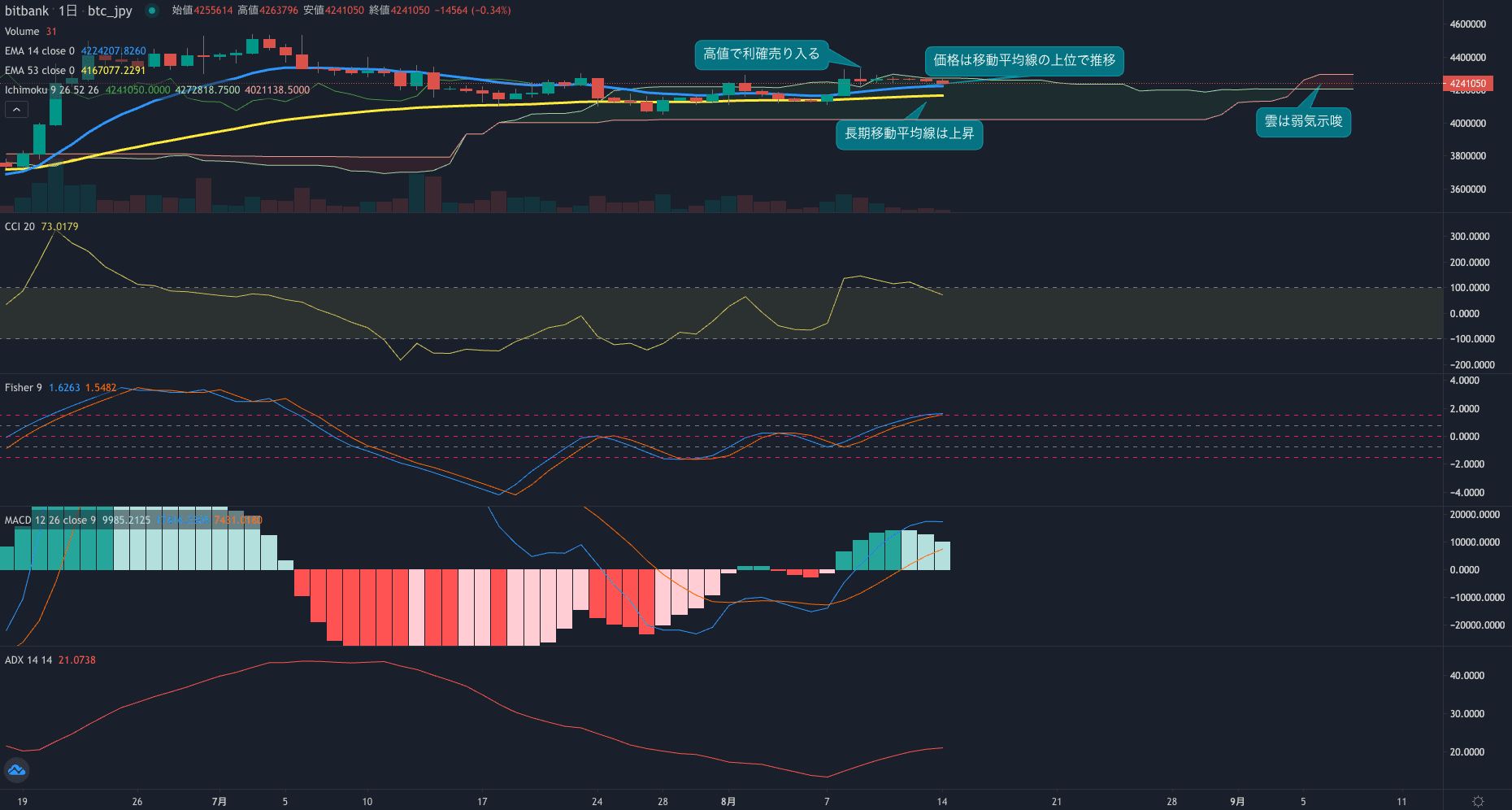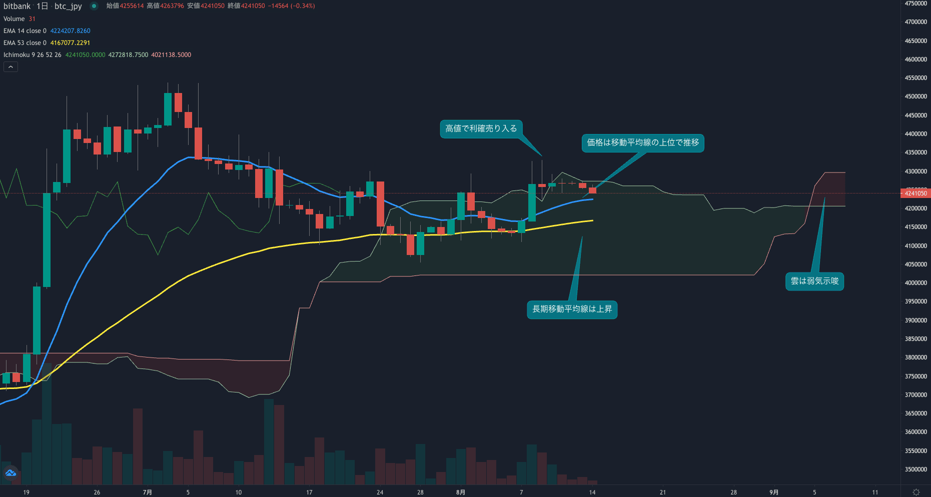 価格は14EMA(425.5万円)を上回り強気示唆です。53EMA(416.4万円)は上昇しており長期トレンドも強気です。一目均衡表の雲は先行スパン1(420.5万円)が先行スパン2(429.5万円)を下回り弱気示唆です。