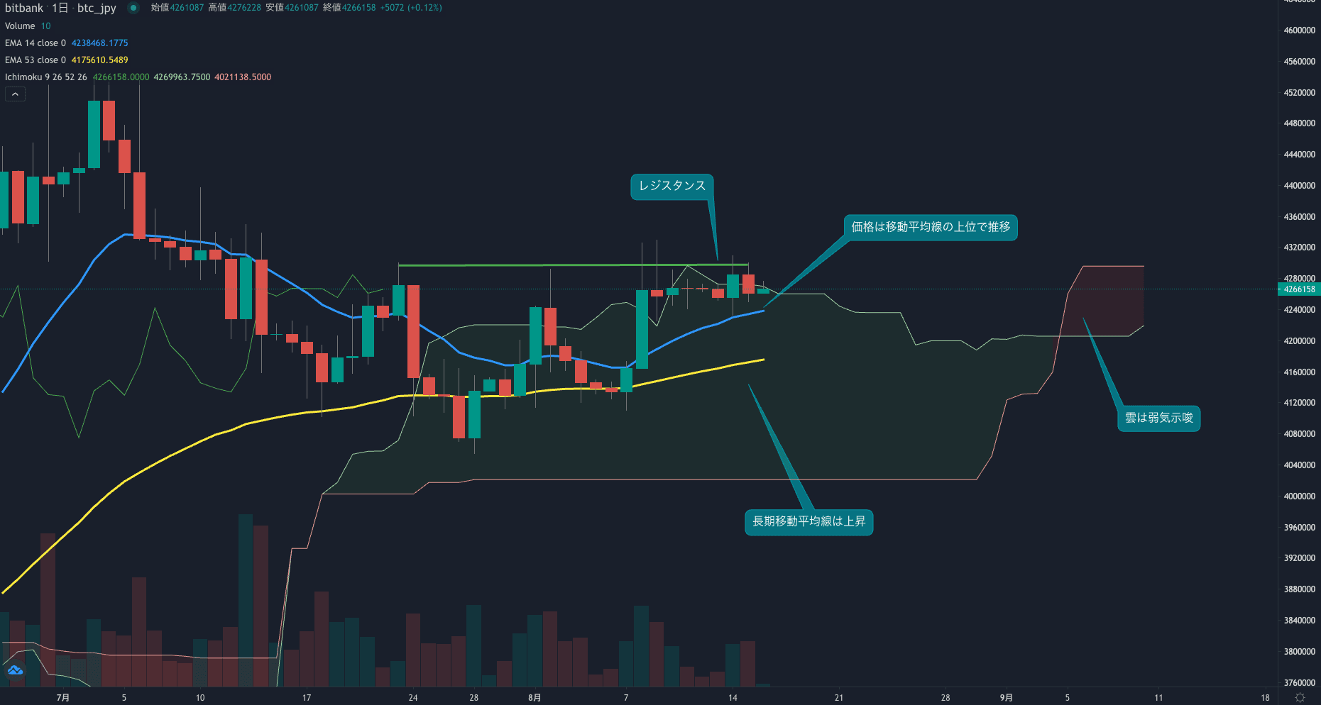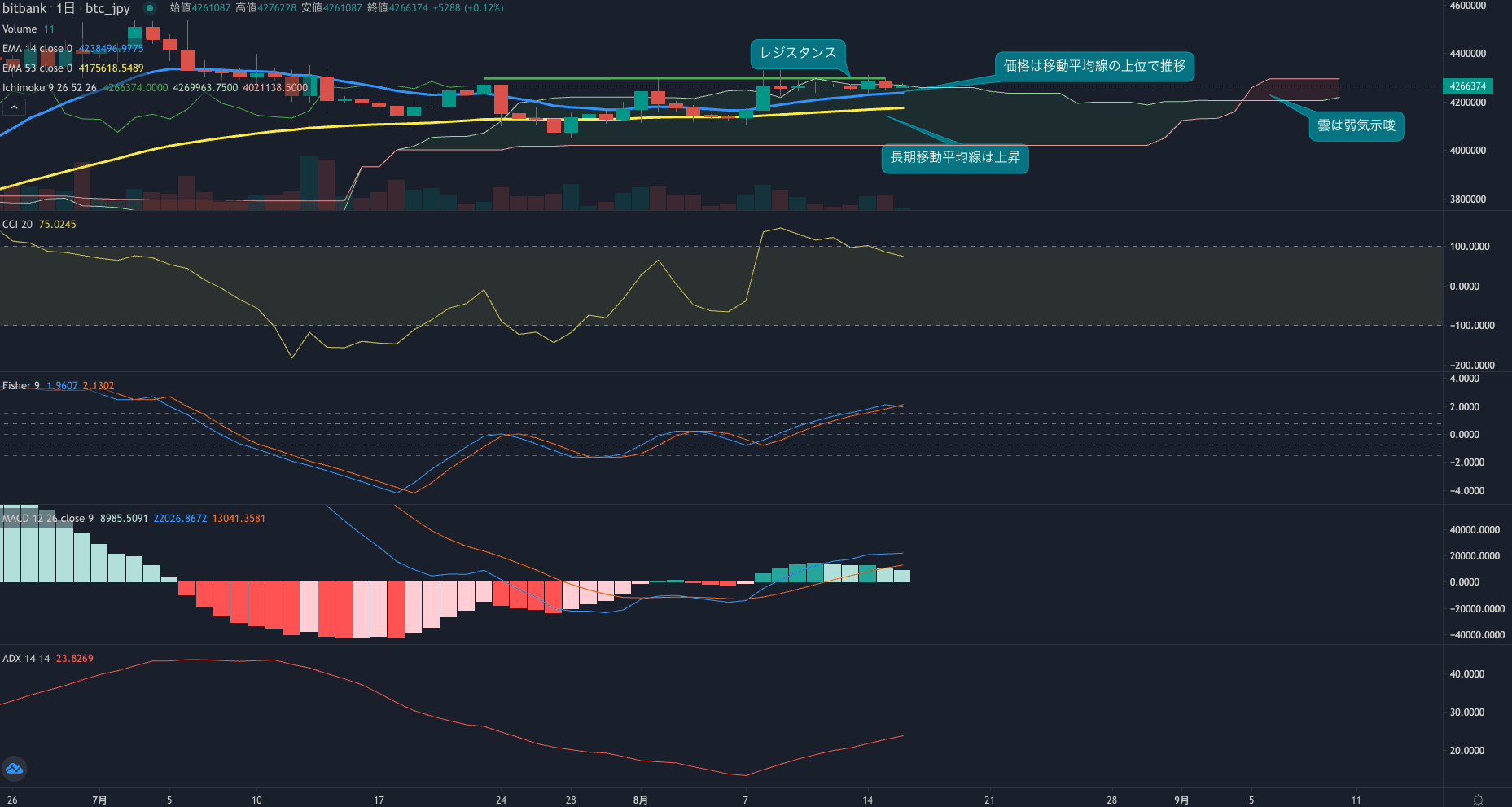 価格は14EMA(423.4万円)を上回り強気示唆です。53EMA(417.2万円)は上昇しており長期トレンドも強気です。一目均衡表の雲は先行スパン1(420.5万円)が先行スパン2(429/5万円)を下回り弱気示唆です。