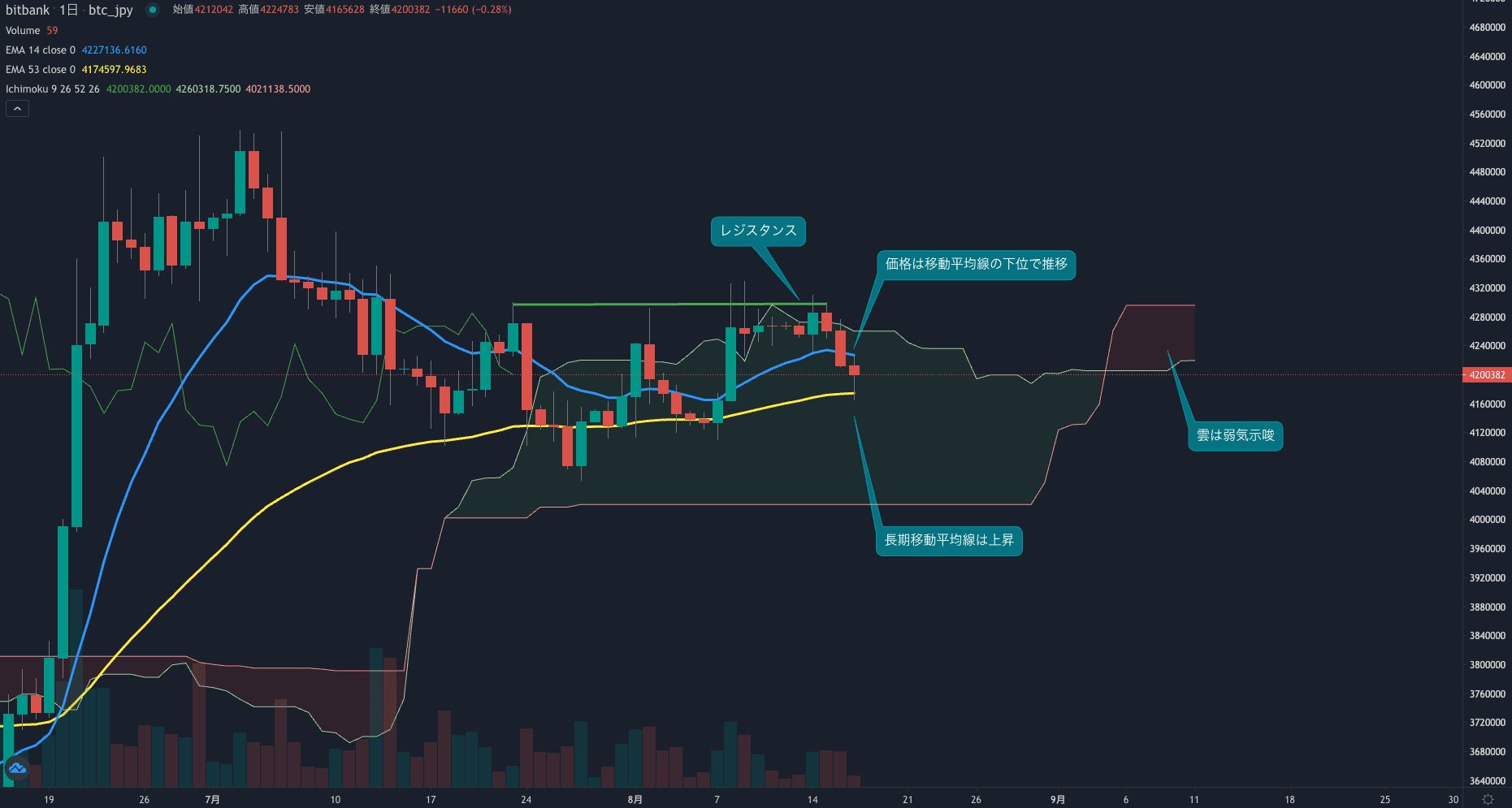 価格は14EMA(423.1万円)を下回り弱気示唆です。53EMA(417.3万円)は上昇しており長期トレンドは強気です。一目均衡表の雲は先行スパン1(421.9万円)が先行スパン2(429.5万円)を下回り弱気示唆です。