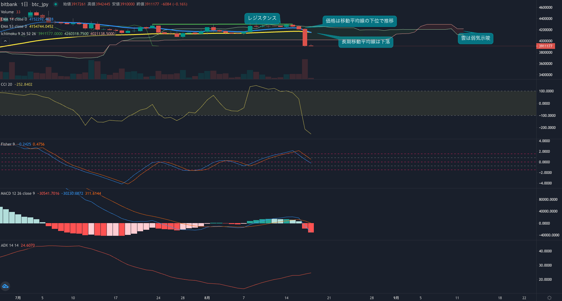 - オシレーターも今週マイナスで推移し始めています。CCIは-213まで下落。Fisherはプラス圏を維持も下落しています。MACDは遅行線を下回り、マイナス圏へ突入しています。