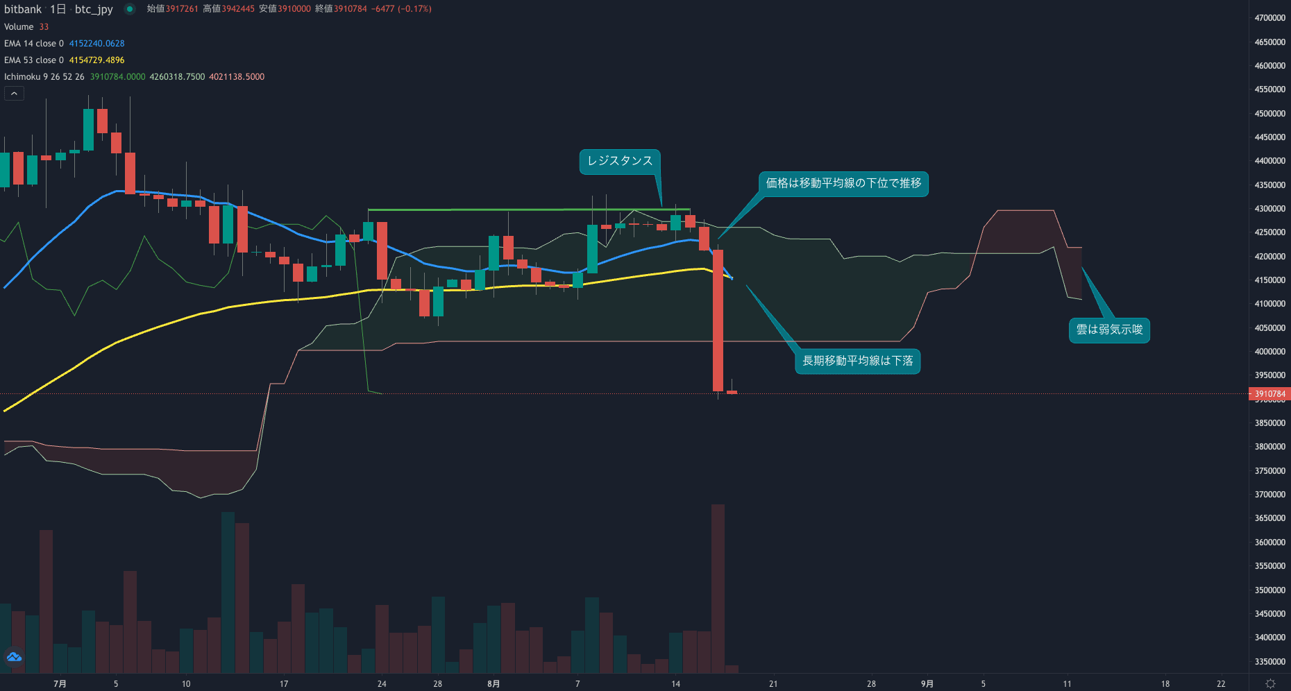 - 昨日のビットコインは7.0%下落し、終値は391.7万円でした。昨日は久々に大きな下落となり、価格は一気に400万円を割り込みました。日足は一目均衡表の雲も下に抜け、かなり弱気の値動きとなりました。