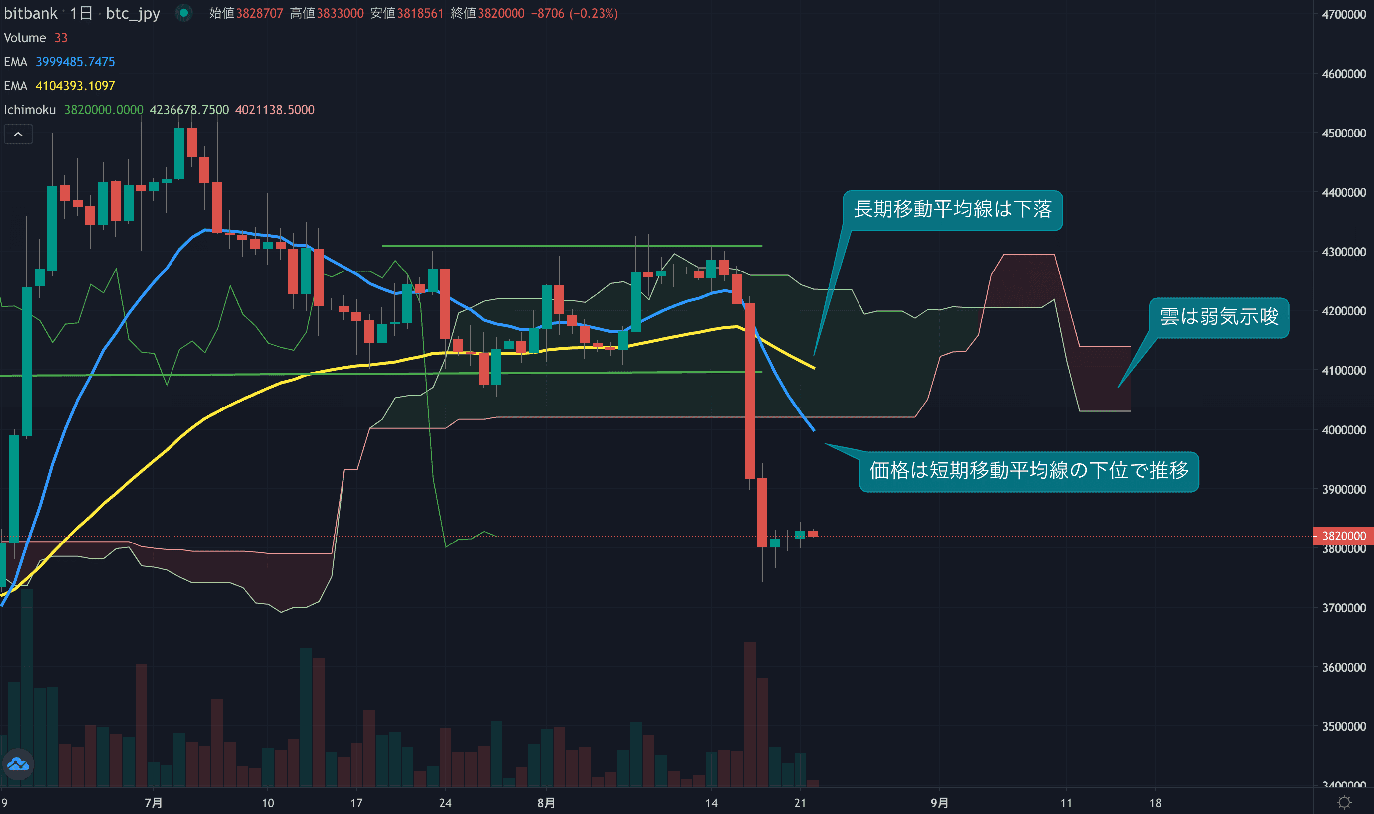 価格は14EMA(402.7万円)を下回り弱気示唆です。53EMA(411.5万円)は下落しており長期トレンドも弱気です。一目均衡表の雲は先行スパン1(403.1万円)が先行スパン2(414.0万円)を下回り弱気示唆です。