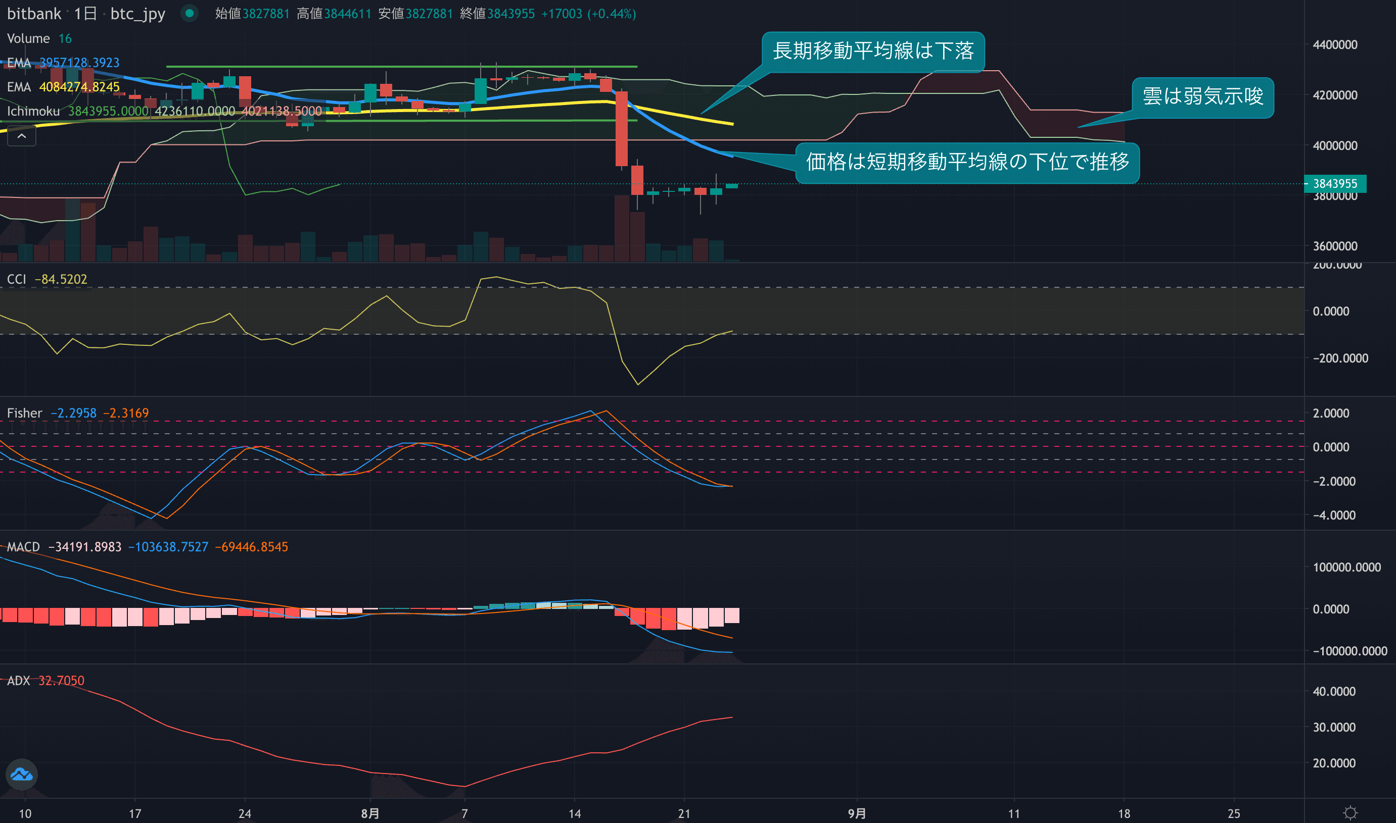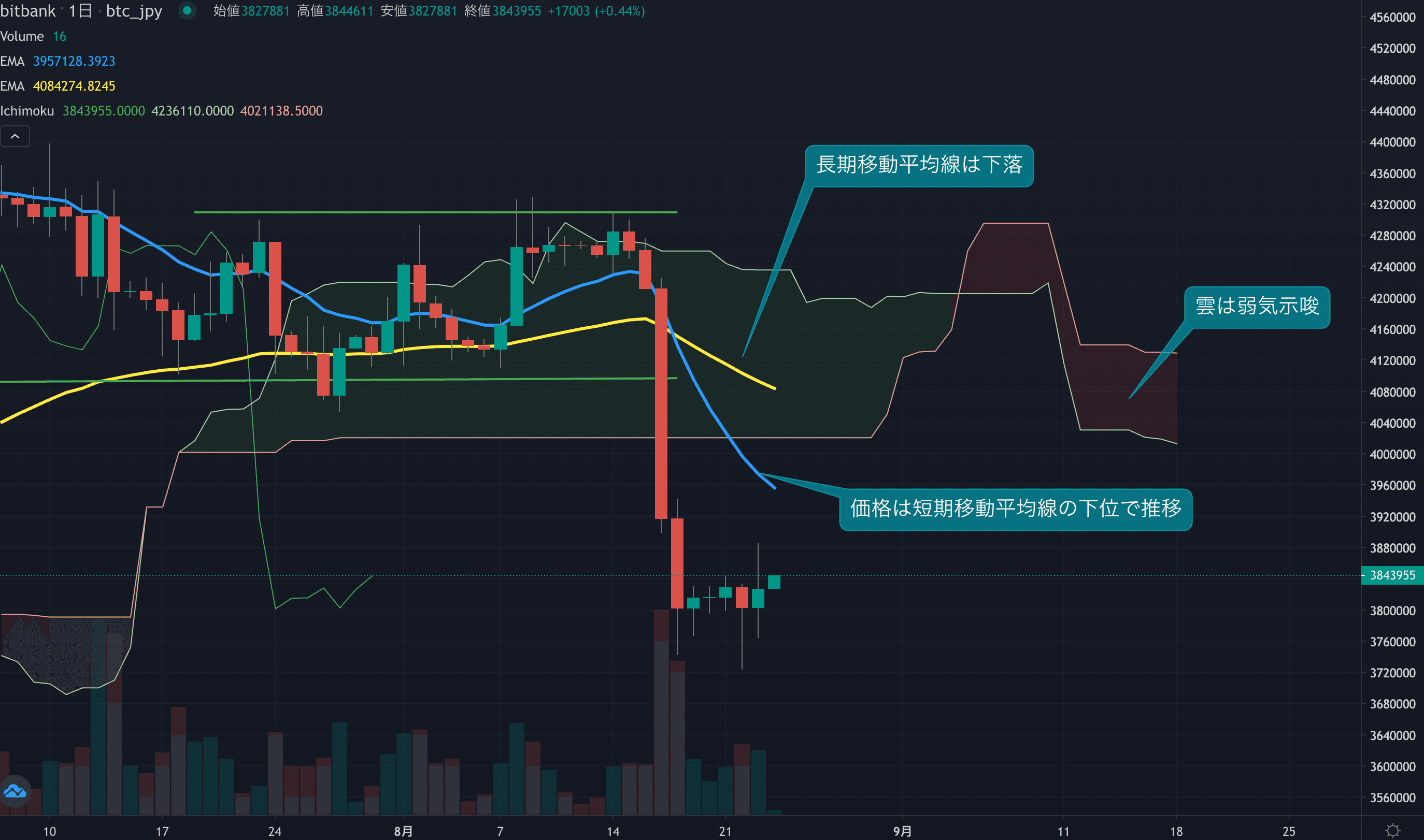 価格は14EMA(397.4万円)を下回り弱気示唆です。53EMA(409.3万円)は下落しており長期トレンドも弱気です。一目均衡表の雲は先行スパン1(401.9万円)が先行スパン2(413.0万円)を下回り弱気示唆です。
