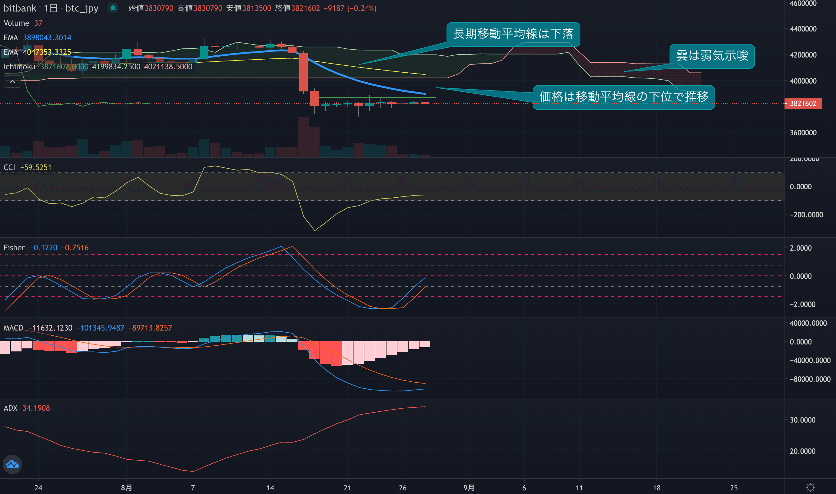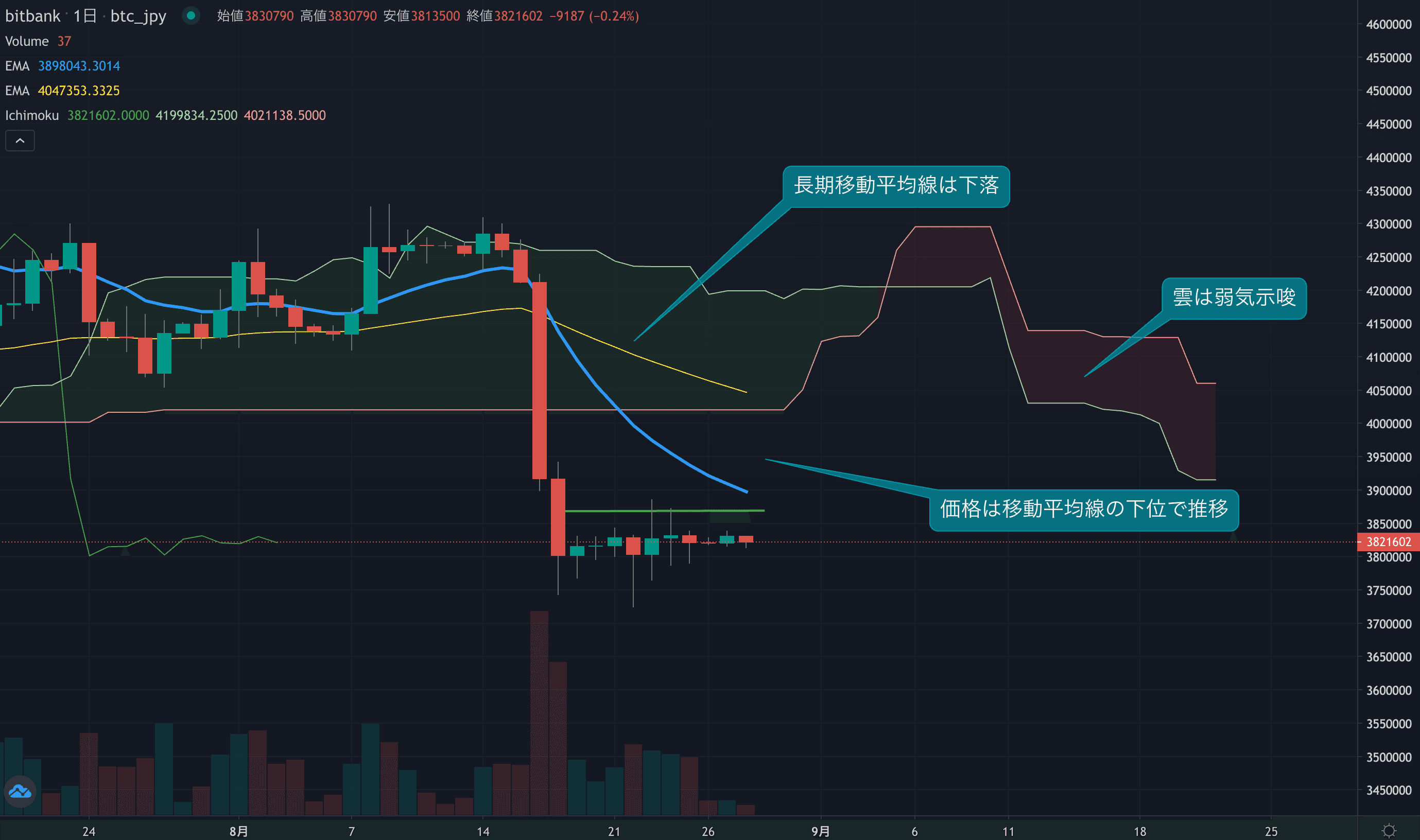 価格は14EMA(290.3万円)を下回り弱気示唆です。53EMA(405.6万円)は下落しており長期トレンドも弱気です。一目均衡表の雲は先行スパン1(391.5万円)が先行スパン2(406.0万円)を下回り弱気示唆です。