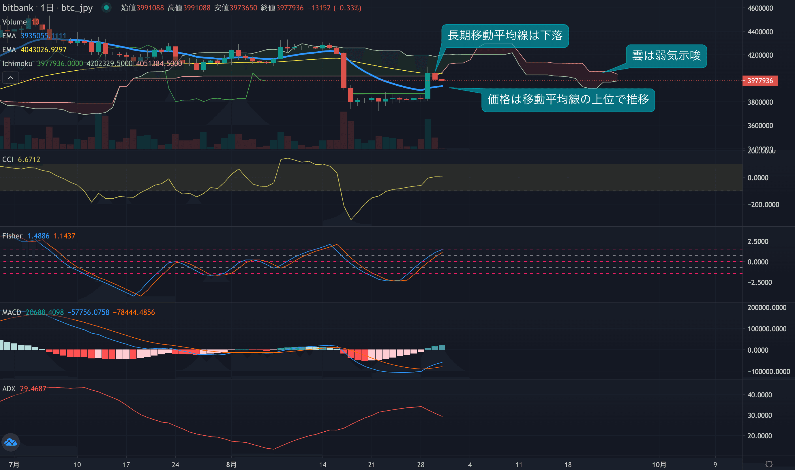 - 今週のビットコインはこれまで3.8%の上昇を記録しています。一昨日の上昇により短期のモメンタムは回復しましたが、長期トレンドはまだ弱気を示唆しています。日足は一目均衡表の下でまだ推移しています。今週のADXは下落しており、強気トレンドの発生にはもう一段の上昇が必要であることを示しています。400万円より上にはテクニカル指標のレジスタンスがあり、上値が重い展開が予想されます。