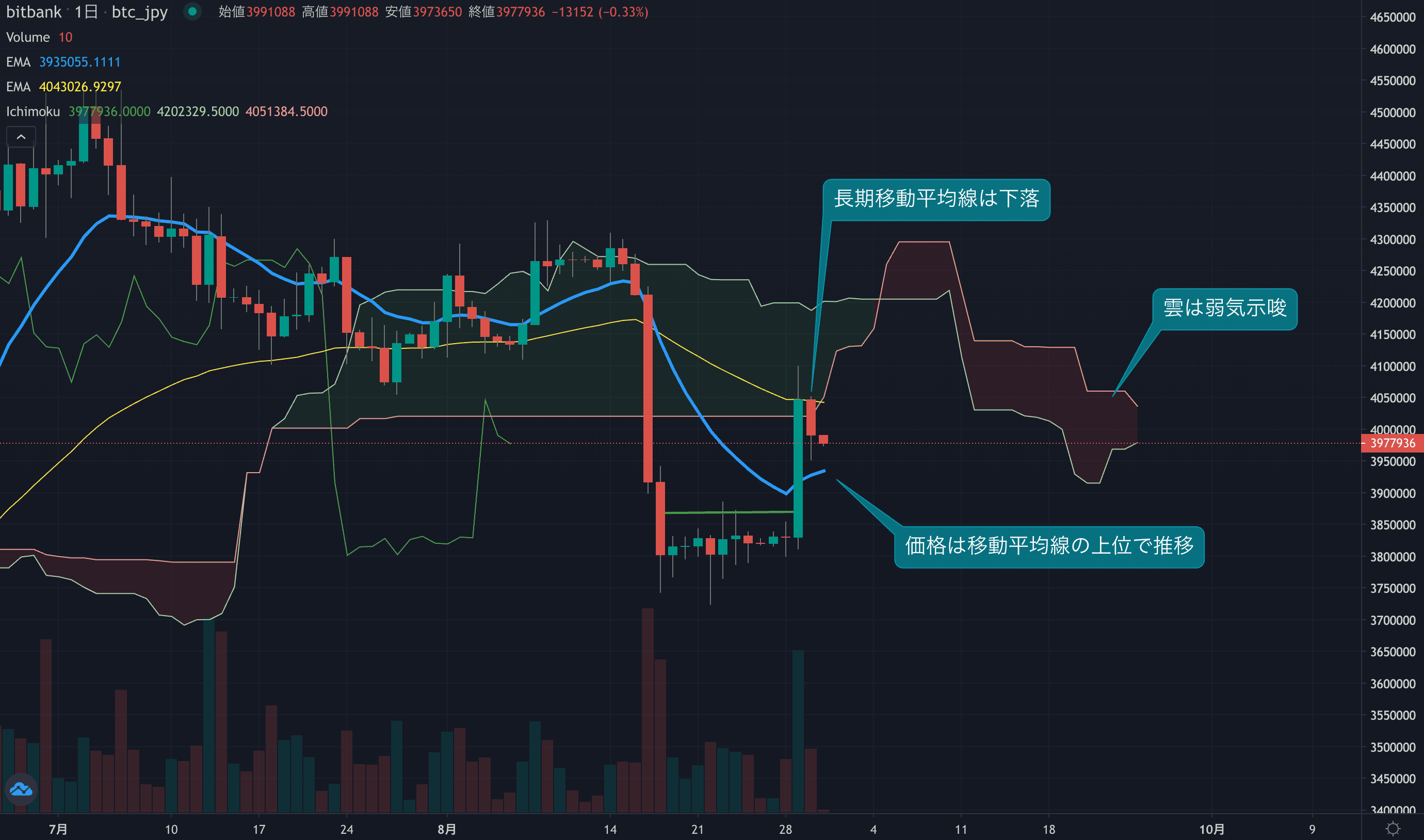 価格は14EMA(392.8万円)を上回り強気示唆です。53EMA(404.5万円)は下落しており長期トレンドも弱気です。一目均衡表の雲は先行スパン1(396.9万円)が先行スパン2(406.0万円)を下回り弱気示唆です。