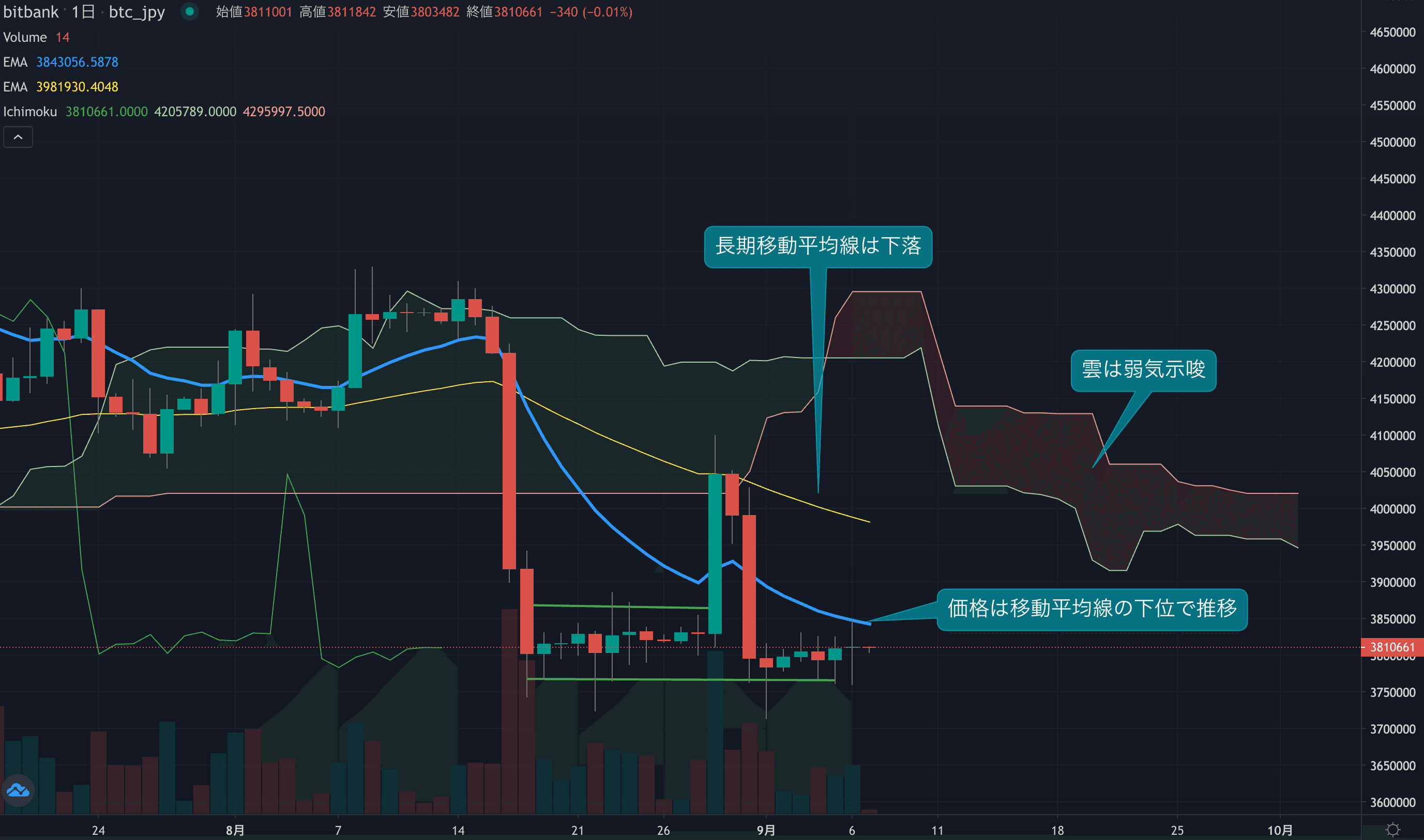 価格は14EMA(384.8万円)を下回り弱気示唆です。53EMA(398.8万円)は下落しており長期トレンドも弱気です。一目均衡表の雲は先行スパン1(395.8万円)が先行スパン2(402.1万円)を下回り弱気示唆です。