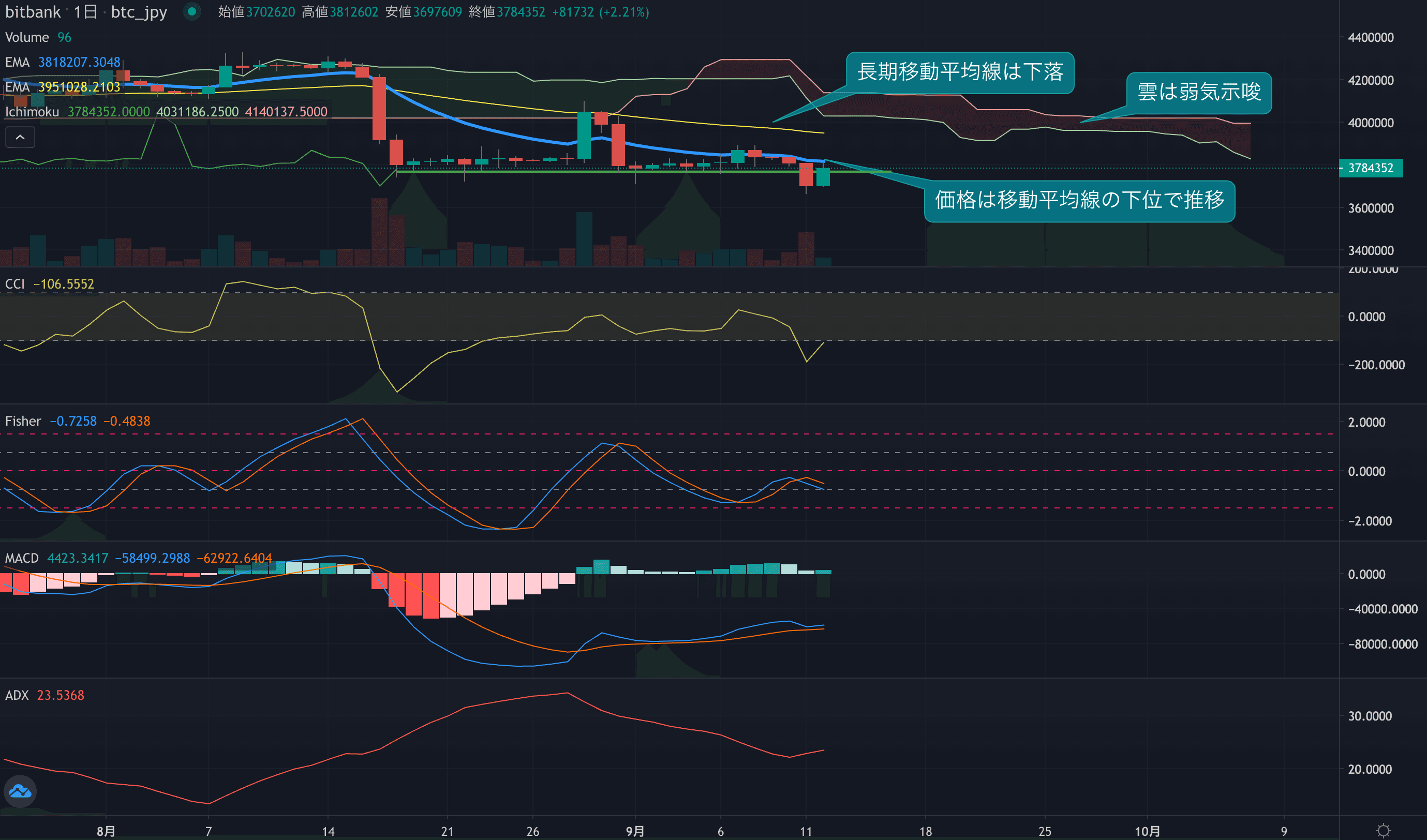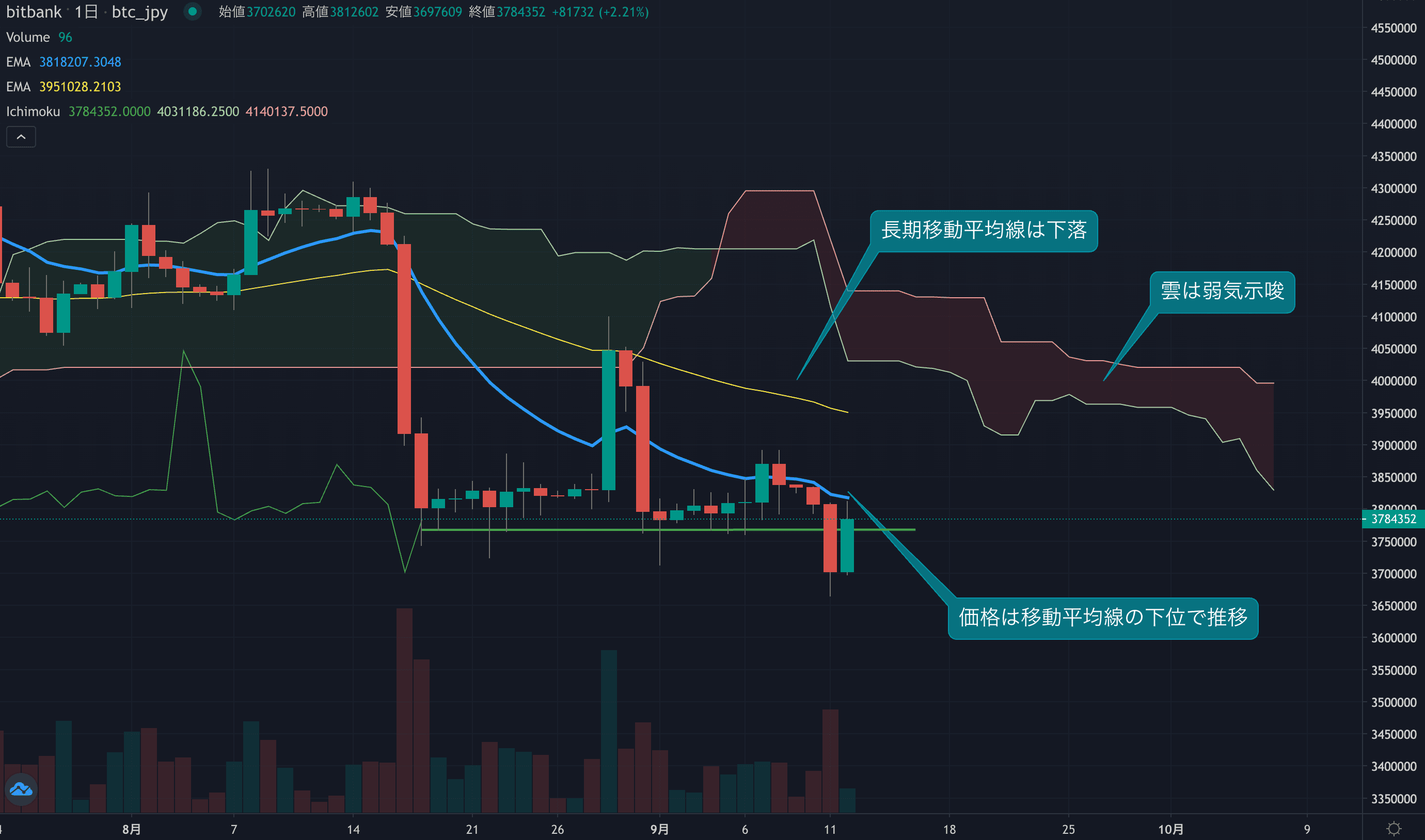 価格は14EMA(382.3万円)を下回り弱気示唆です。53EMA(395.7万円)は下落しており長期トレンドも弱気です。一目均衡表の雲は先行スパン1(386.1万円)が先行スパン2(399.6万円)を下回り弱気示唆です。
