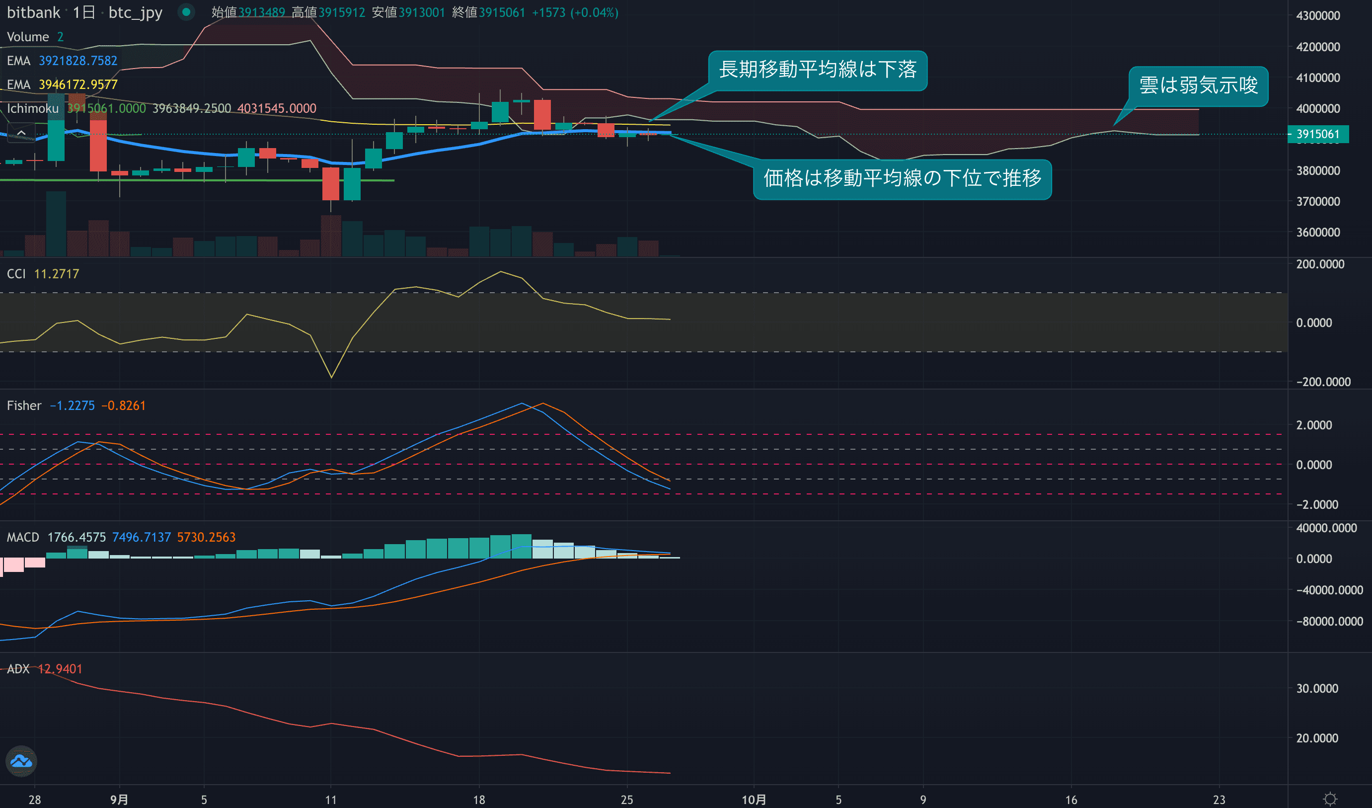 価格は14EMA(392.2万円)を下回り弱気示唆です。53EMA(394.7万円)は下落しており長期トレンドも弱気です。一目均衡表の雲は先行スパン1(391.4万円)が先行スパン2(399.6万円)を下回り弱気示唆です。
