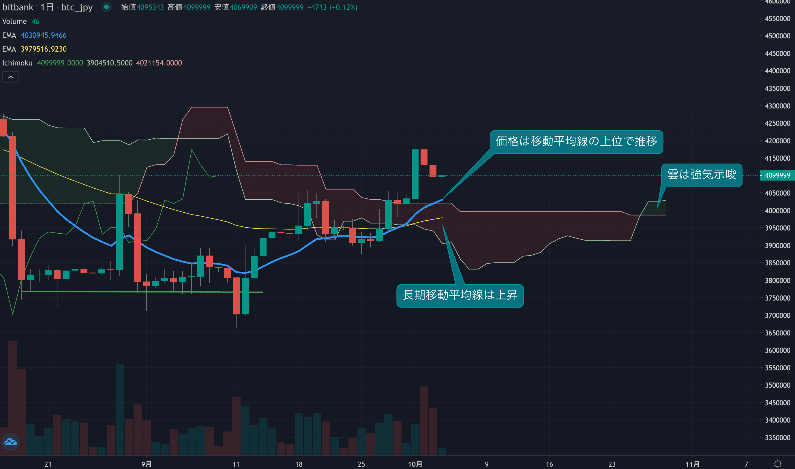 - 価格は14EMA(402.0万円)を上回り強気示唆です。53EMA(397.4万円)は上昇しており長期トレンドも強気です。一目均衡表の雲は先行スパン1(402.5万円)が先行スパン2(398.6万円)を上回り強気示唆です。