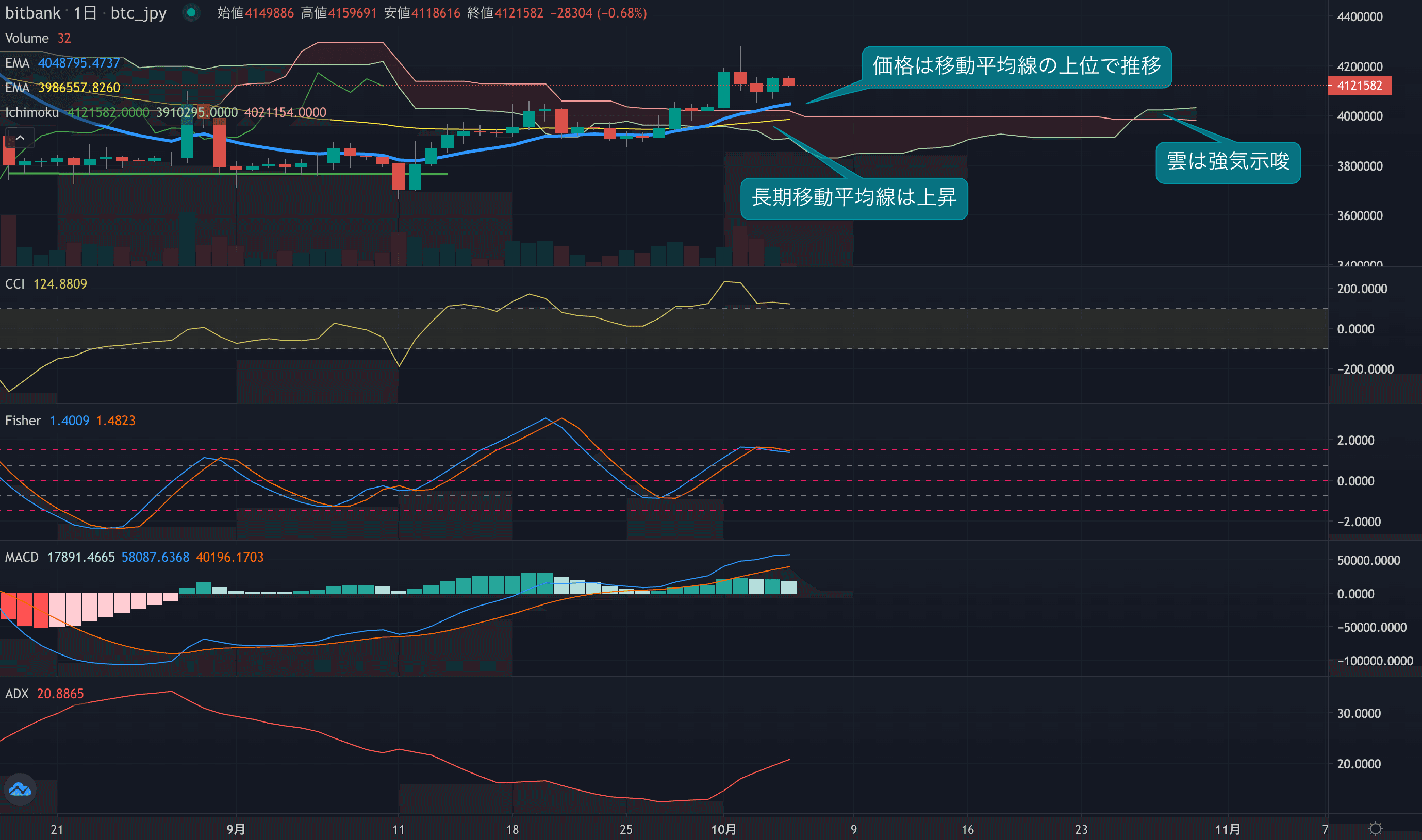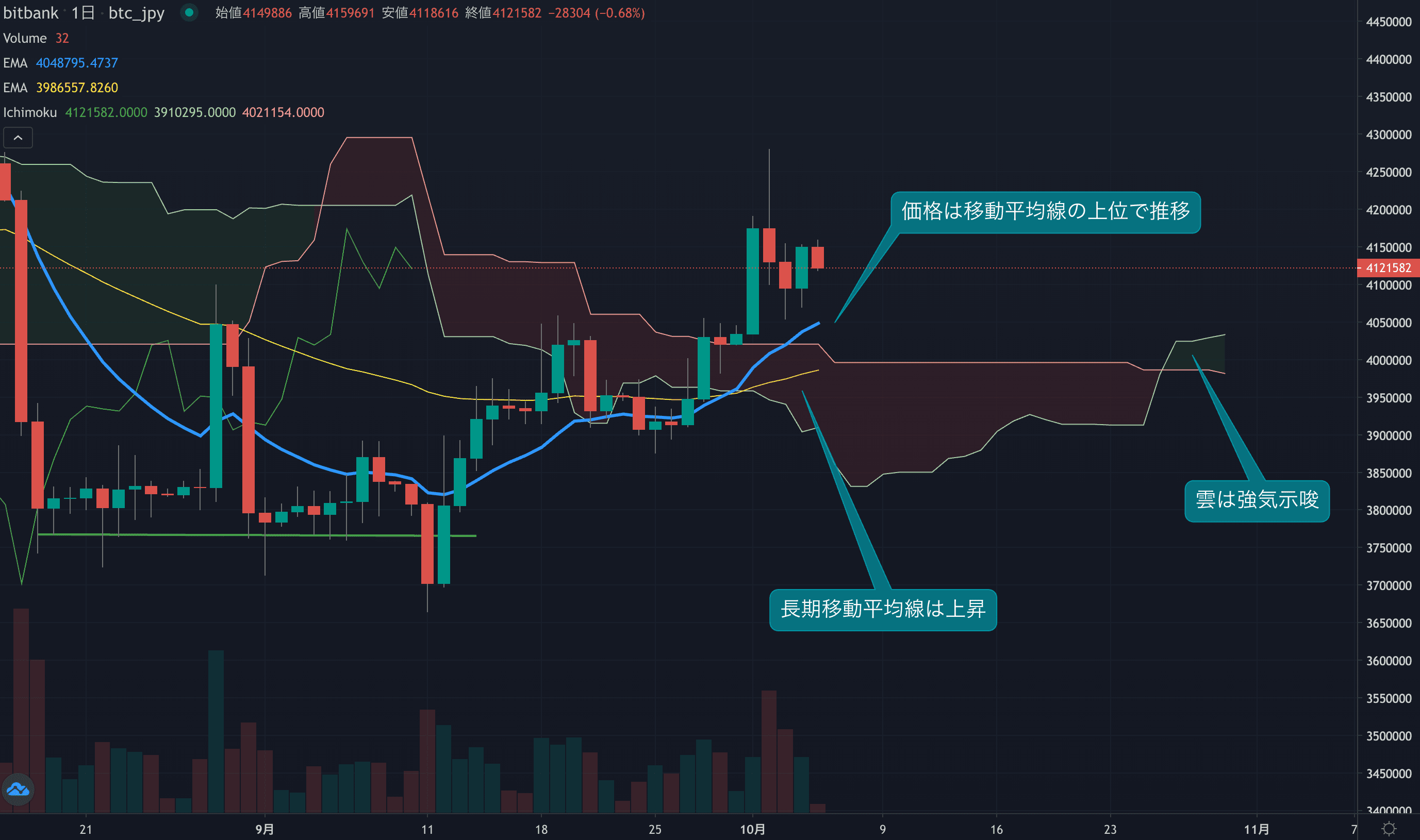 - 価格は14EMA(403.7万円)を上回り強気示唆です。53EMA(398.1万円)は上昇しており長期トレンドも強気です。一目均衡表の雲は先行スパン1(402.9万円)が先行スパン2(398.6万円)を上回り強気示唆です。