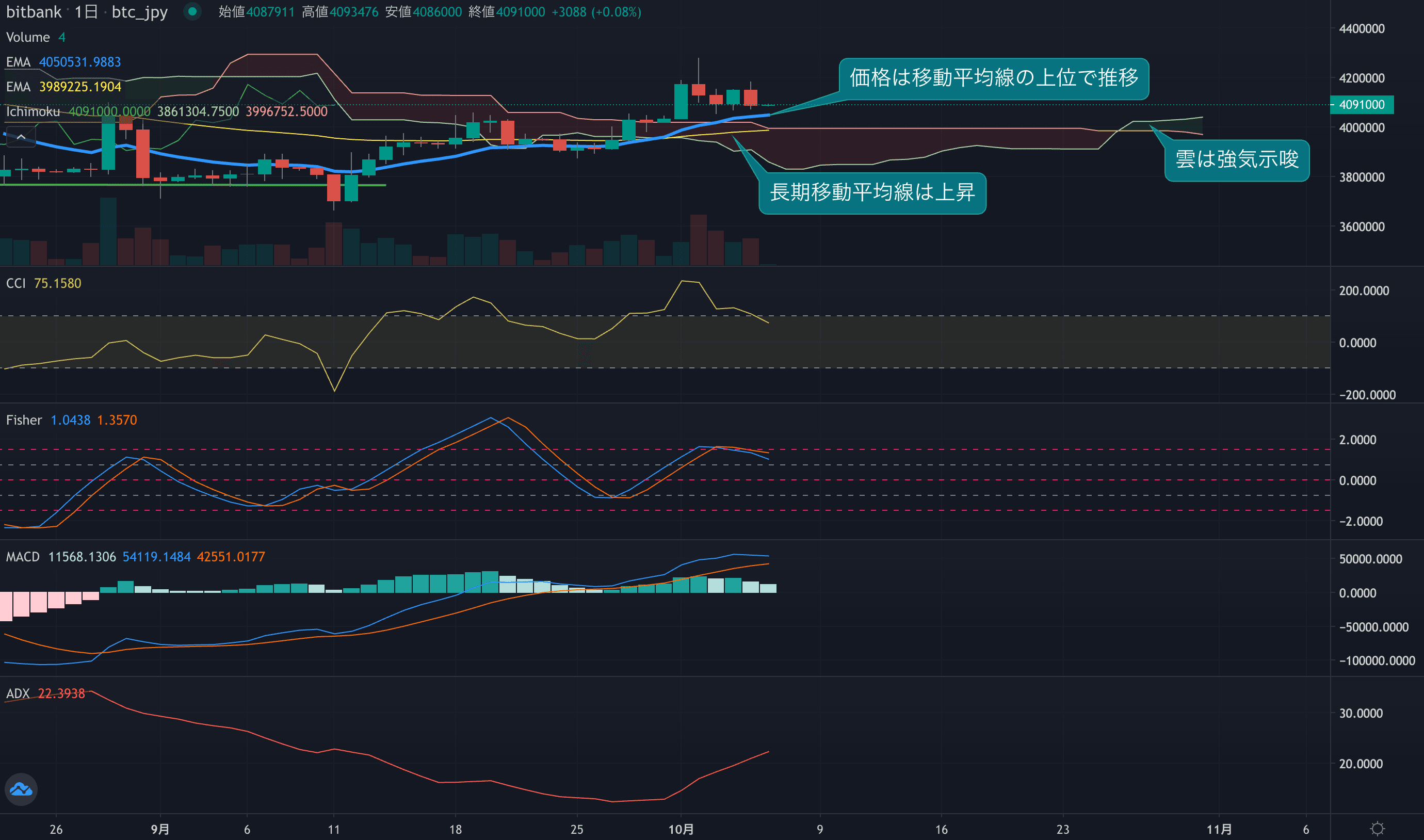 - 価格は14EMA(404.4万円)を上回り強気示唆です。53EMA(398.5万円)は上昇しており長期トレンドも強気です。一目均衡表の雲は先行スパン1(403.3万円)が先行スパン2(398.2万円)を上回り強気示唆です。