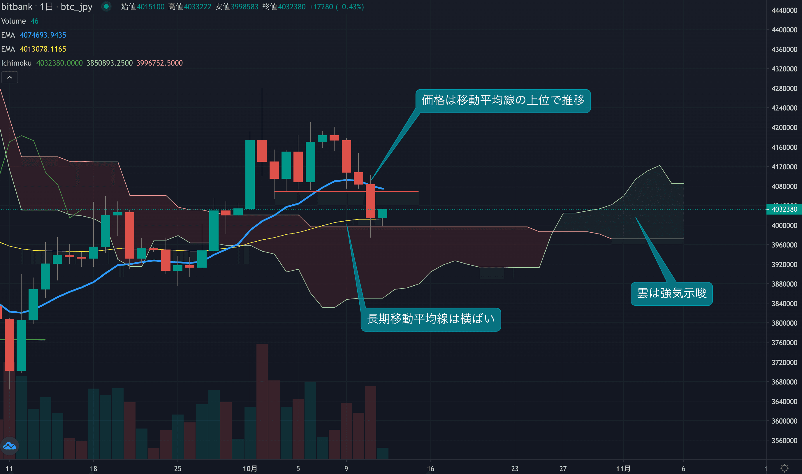 - 価格は14EMA(408.1万円)を下回り弱気示唆です。53EMA(401.2万円)は横ばい推移しており、長期トレンドは中立です。一目均衡表の雲は先行スパン1(408.5万円)が先行スパン2(397.2万円)を上回り強気示唆です。