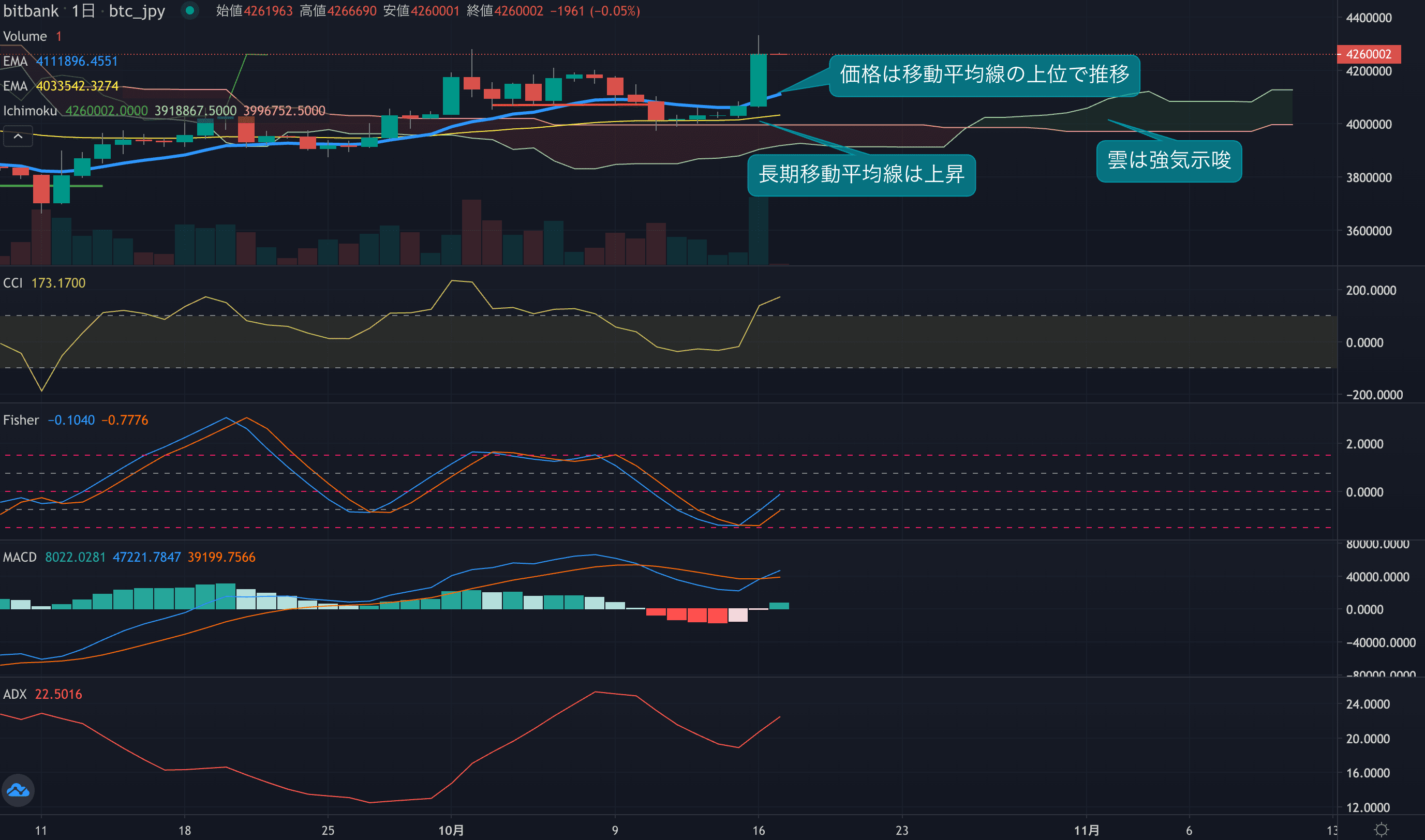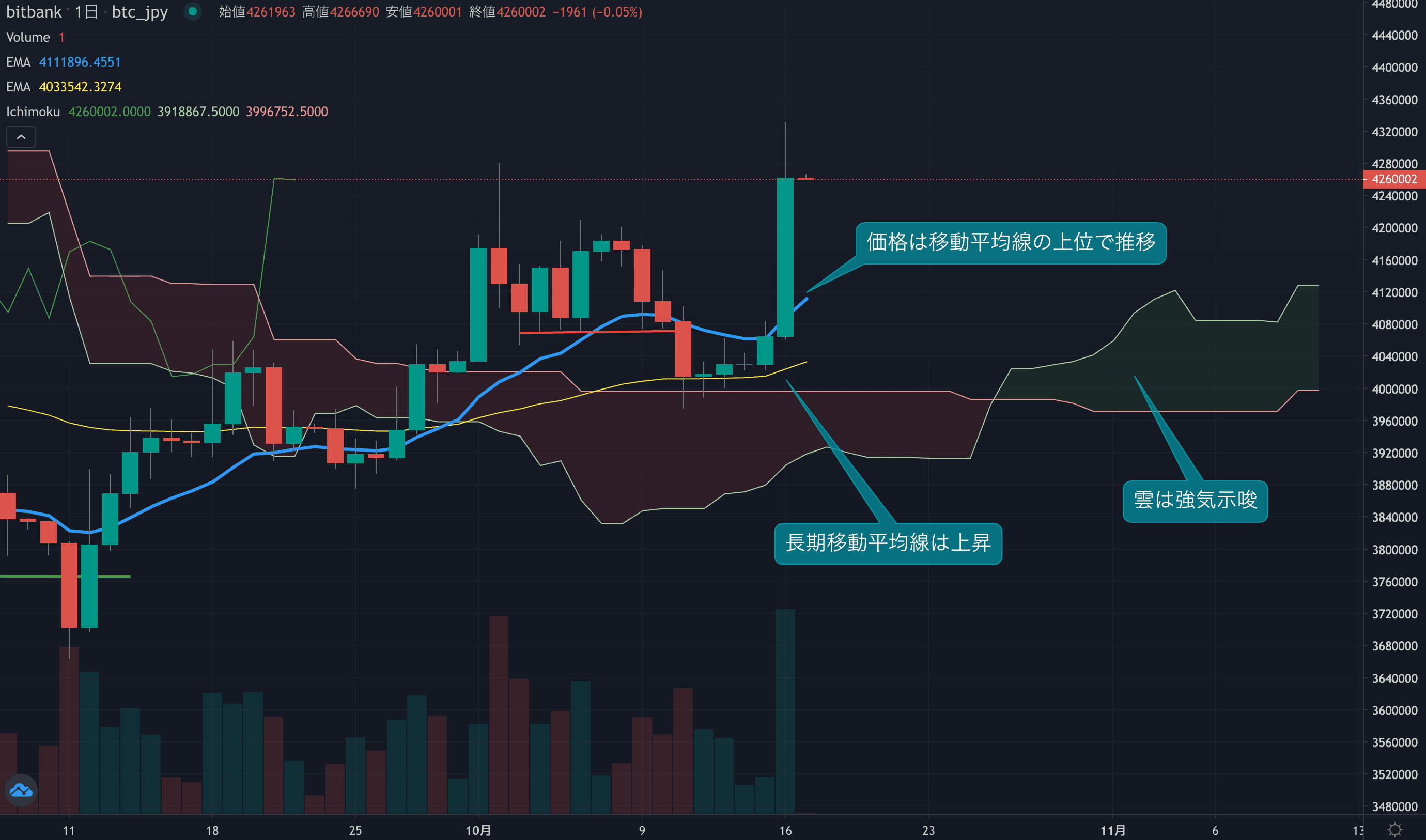 - 価格は14EMA(408.9万円)を上回り強気示唆です。53EMA(402.4万円)は上昇しており、長期トレンドも強気です。一目均衡表の雲は先行スパン1(412.8万円)が先行スパン2(399.7万円)を上回り強気示唆です。