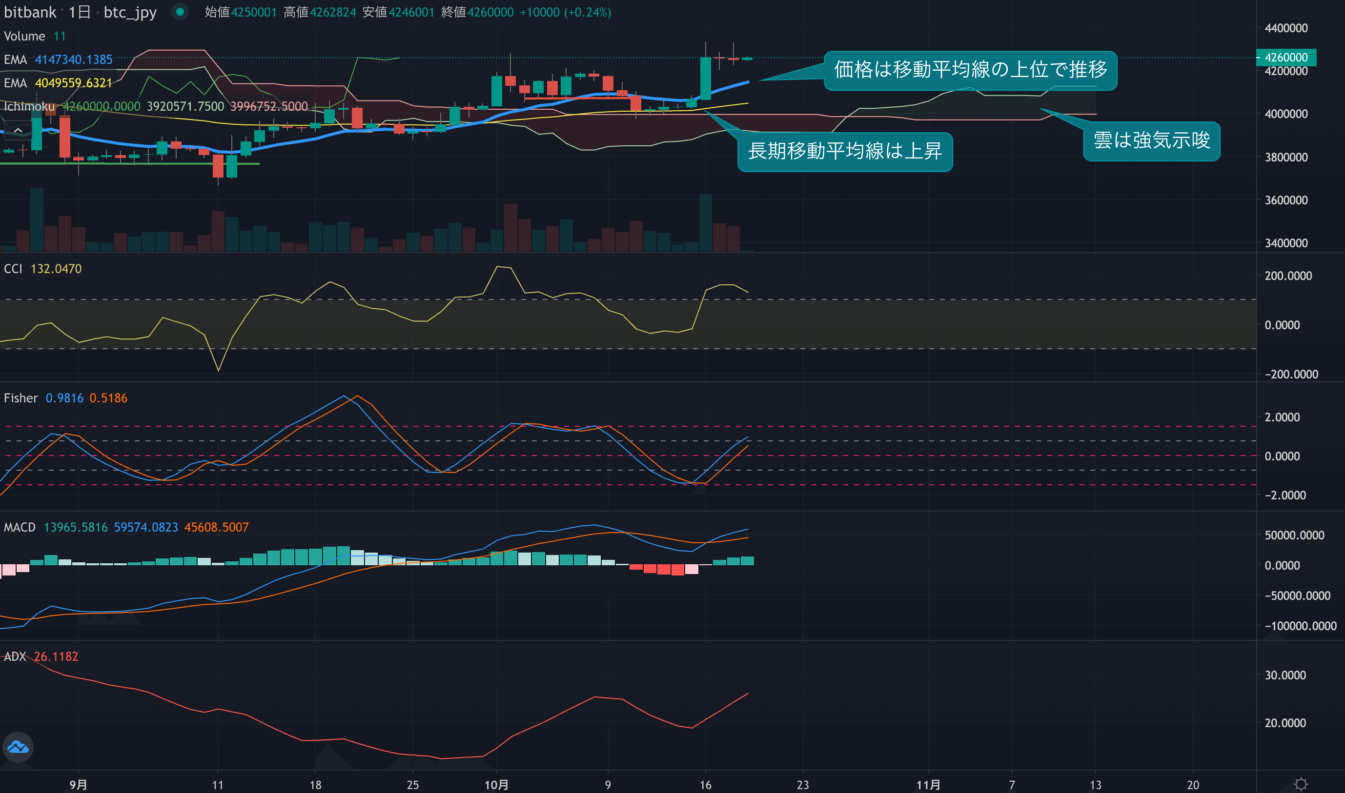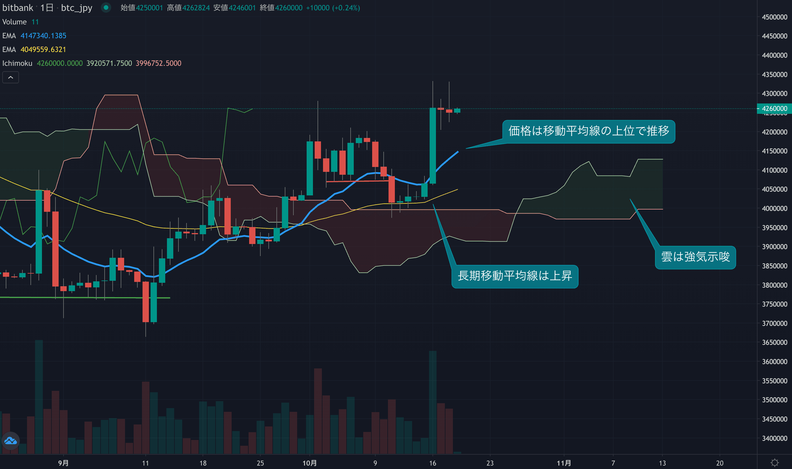 - 価格は14EMA(413.0万円)を上回り強気示唆です。53EMA(404.1万円)は上昇しており、長期トレンドも強気です。一目均衡表の雲は先行スパン1(412.8万円)が先行スパン2(399.7万円)を上回り強気示唆です。