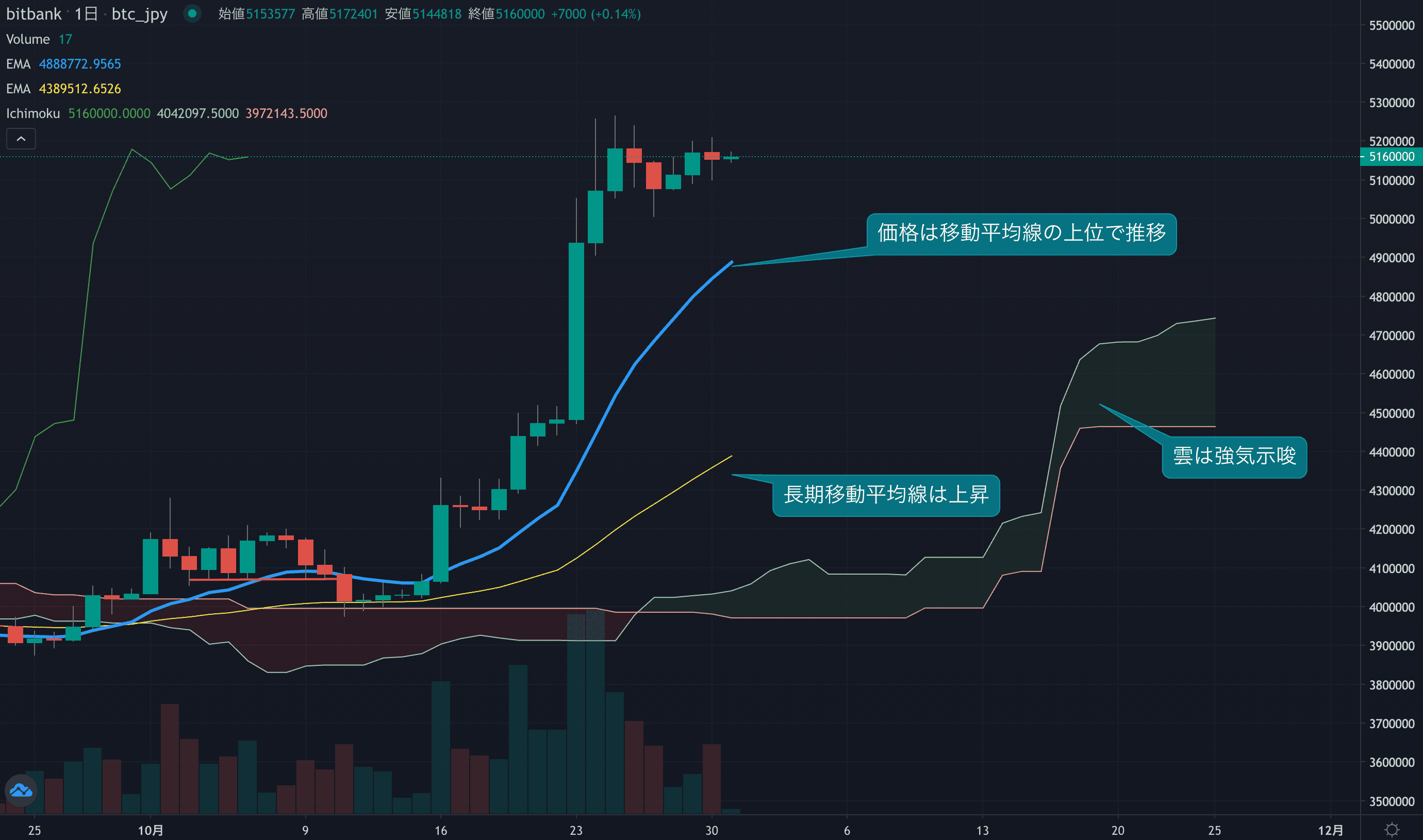 - 価格は14EMA(484.7万円)を上回り強気示唆です。53EMA(435.9万円)は上昇しており、長期トレンドも強気です。一目均衡表の雲は先行スパン1(473.7万円)が先行スパン2(446.5万円)を上回り強気示唆です。