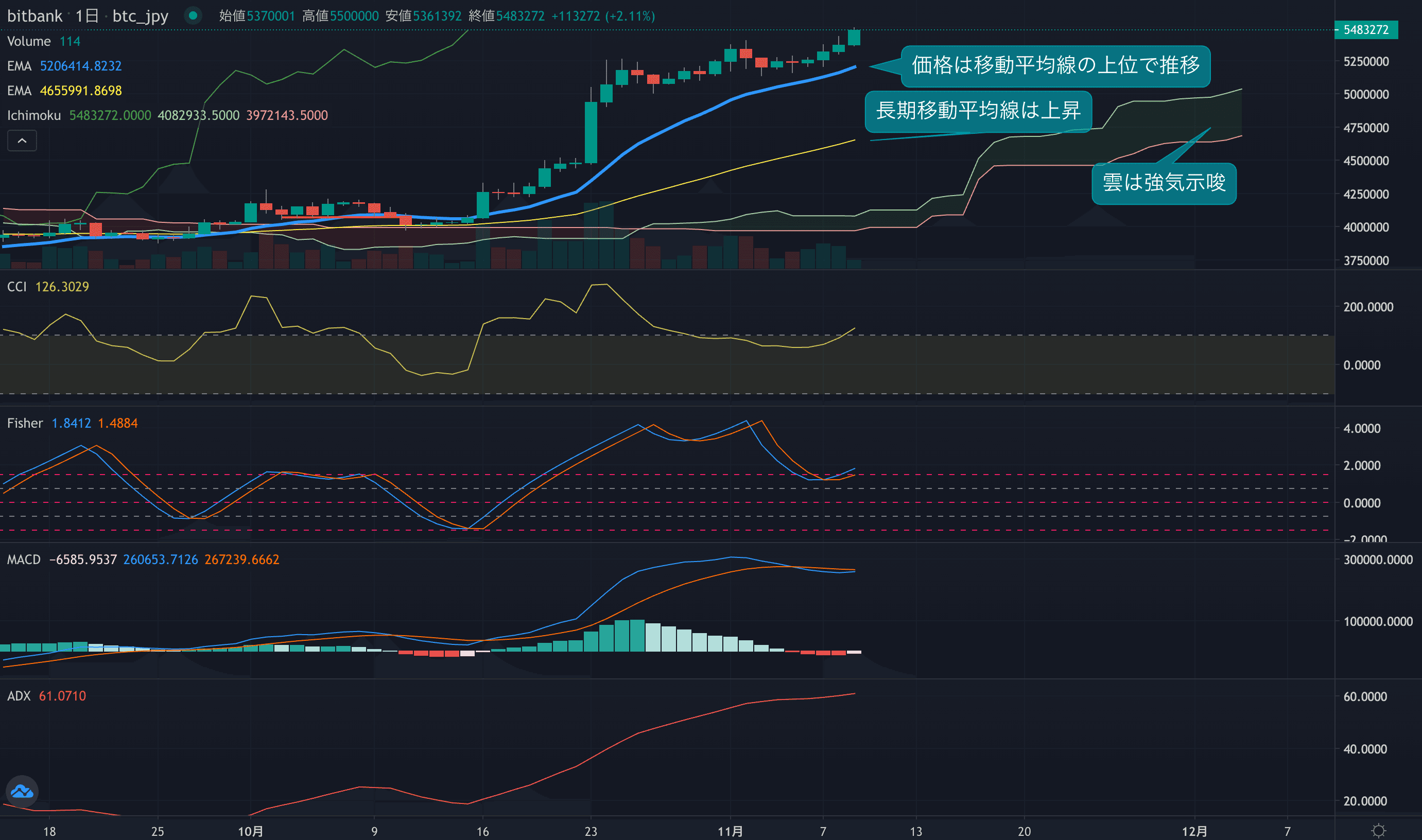 - 今週のビットコインはこれまでの相場の強い買いが継続し、買われています。本日も終値でプラスとなれば4日連続の陽線となります。オシレーターが上昇していたことから高値を試す展開が予想されていましたが、価格は年初来高値549万円まで上昇しています。週後半は高値をどこまで伸ばせるか注目です。現状は相場がかなり強く押し目があれば、即座に買われる相場となっています。