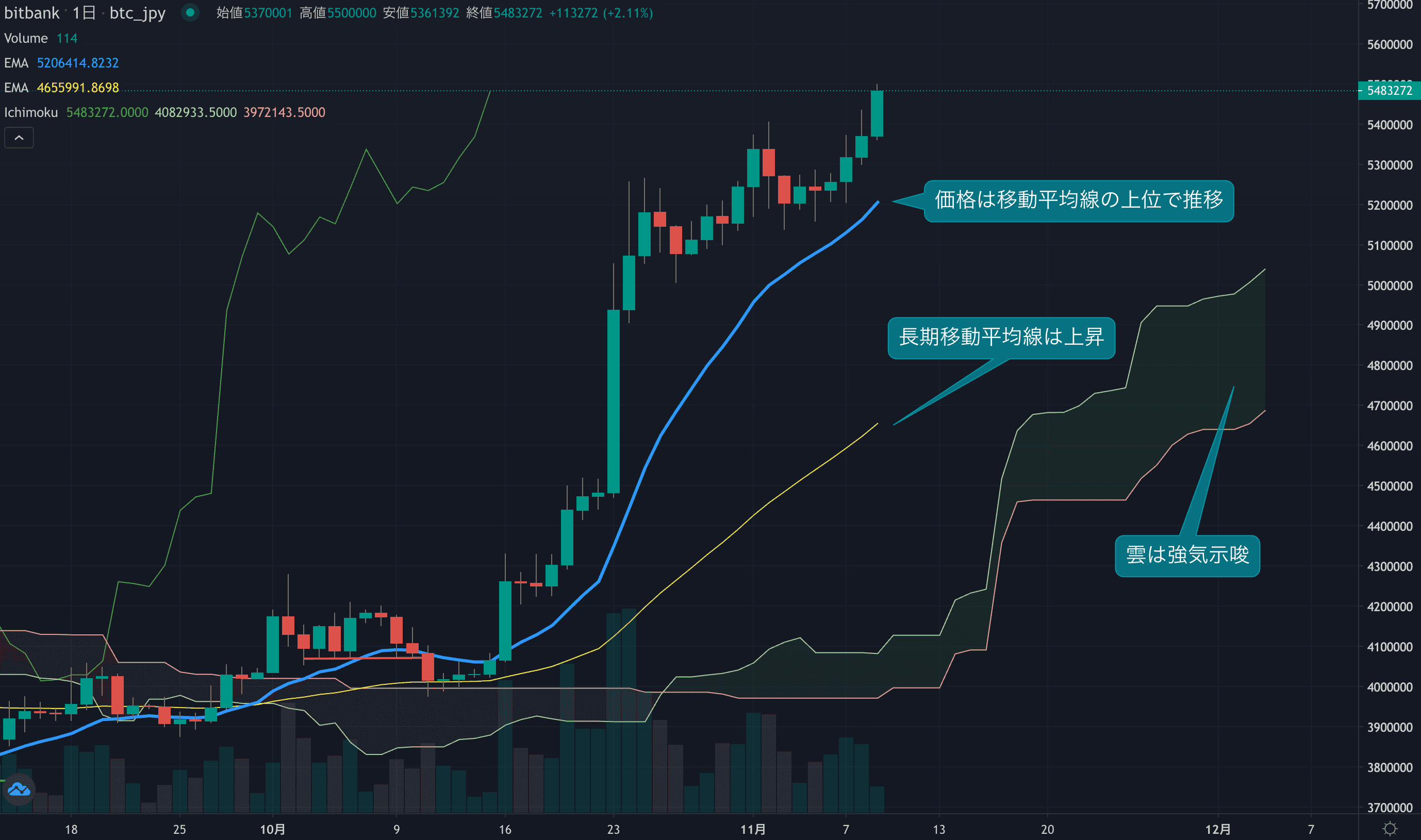 - 価格は14EMA(516.3万円)を上回り強気示唆です。53EMA(462.4万円)は上昇しており、長期トレンドも強気です。一目均衡表の雲は先行スパン1(500.7万円)が先行スパン2(465.5万円)を上回り強気示唆です。