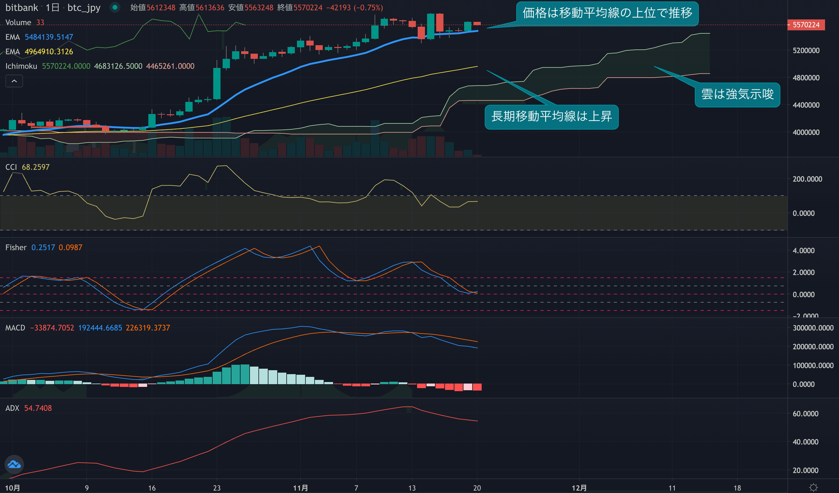 - 価格は14EMA(547.0万円)を上回り強気示唆です。53EMA(494.1万円)は上昇しており、長期トレンドも強気です。一目均衡表の雲は先行スパン1(544.8万円)が先行スパン2(485.9万円)を上回り強気示唆です。