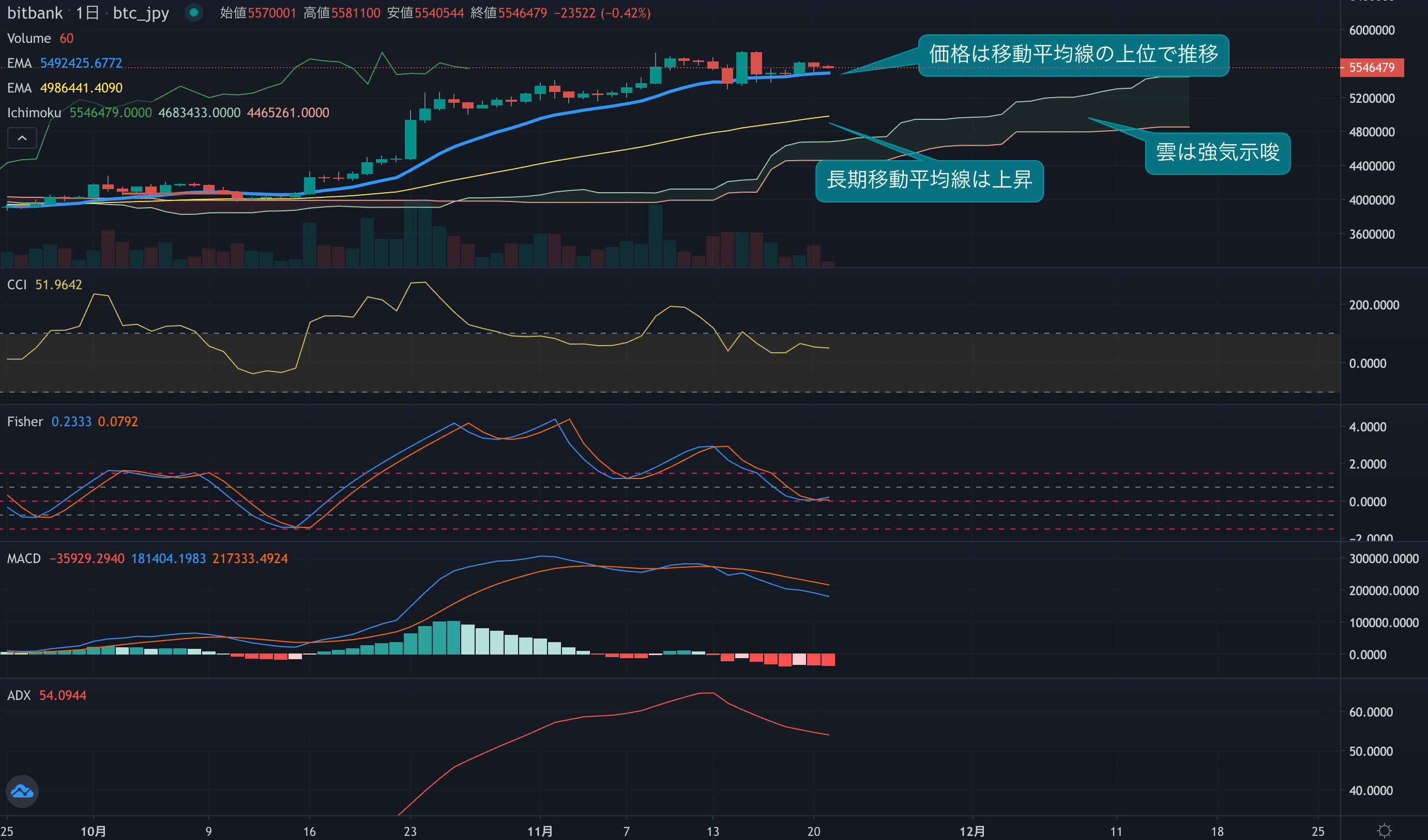- 価格は14EMA(548.4万円)を上回り強気示唆です。53EMA(496.4万円)は上昇しており、長期トレンドも強気です。一目均衡表の雲は先行スパン1(544.8万円)が先行スパン2(485.9万円)を上回り強気示唆です。