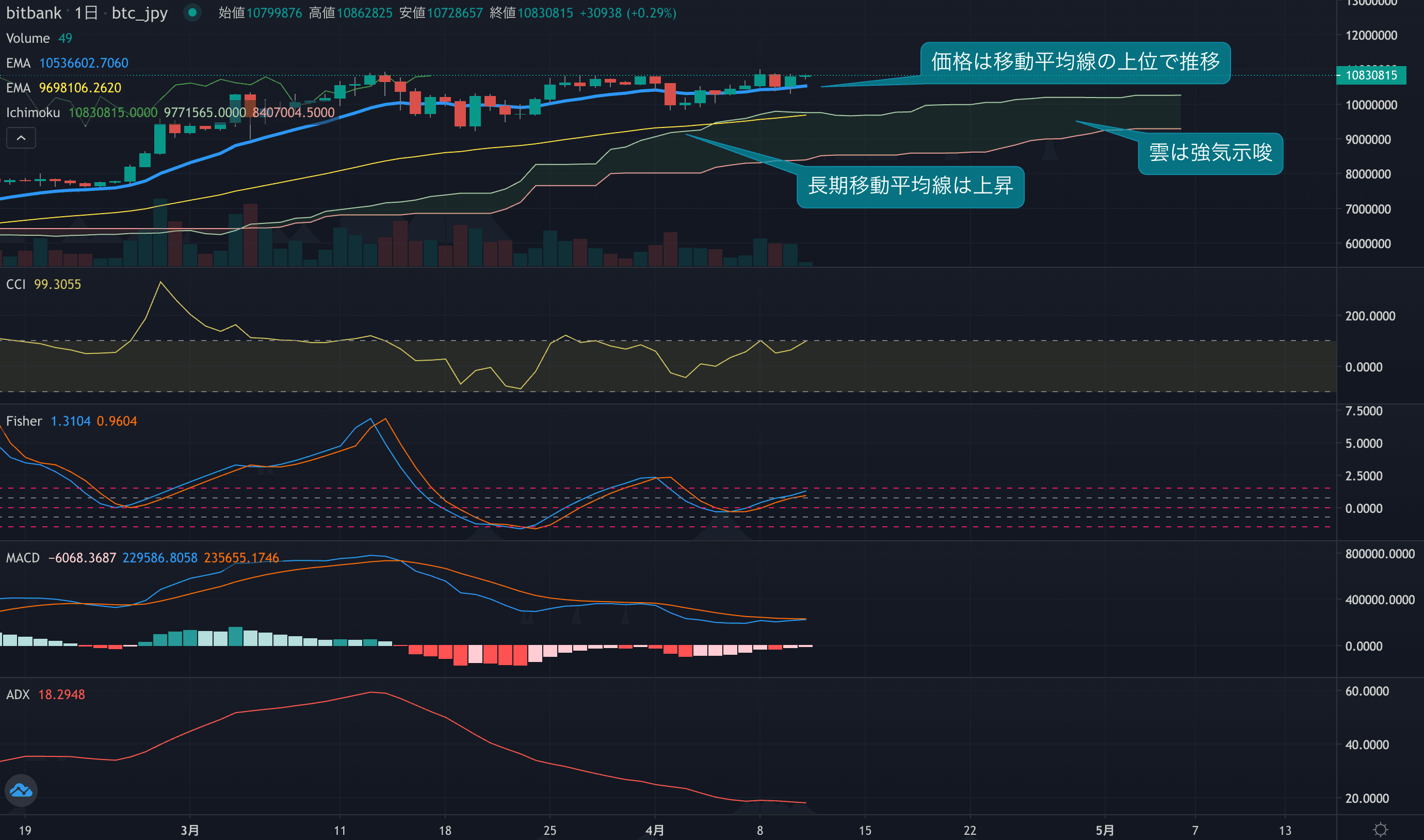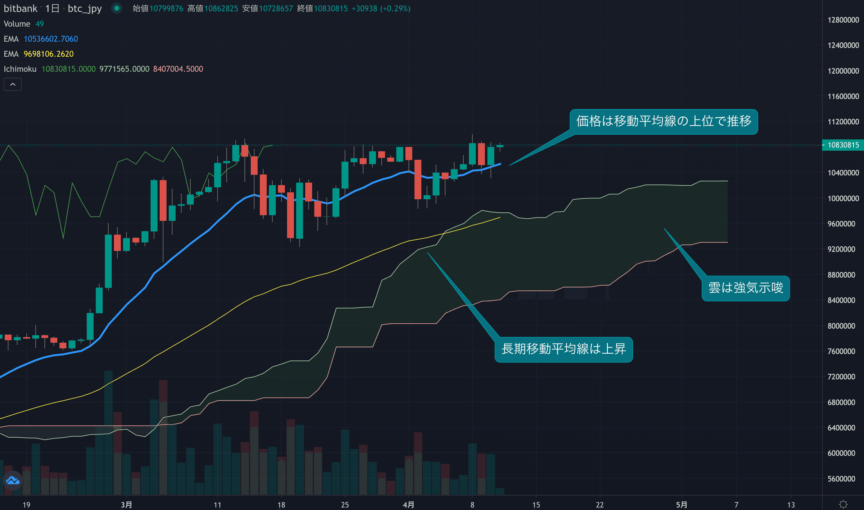 - 価格は14EMA(1049.1万円)を上回り強気示唆です。53EMA(965.4万円)は上昇しており、長期トレンドも強気です。一目均衡表の雲は先行スパン1(1026.8万円)が先行スパン2(930.6万円)を上回り強気示唆です。