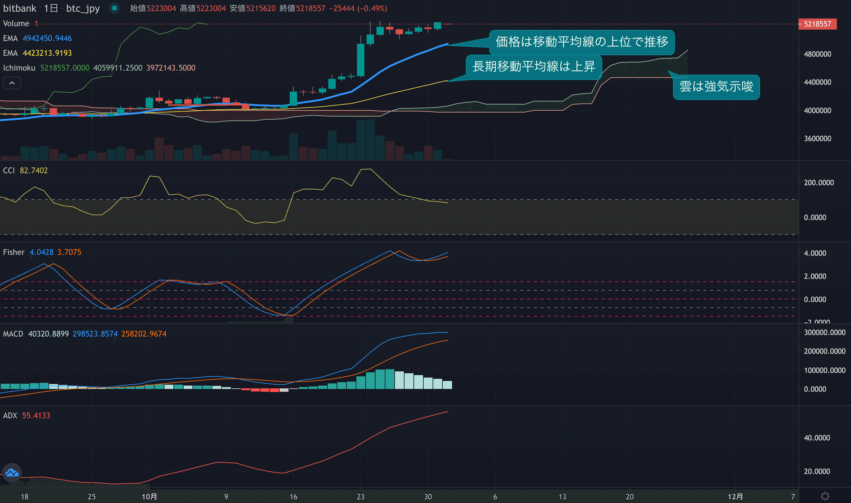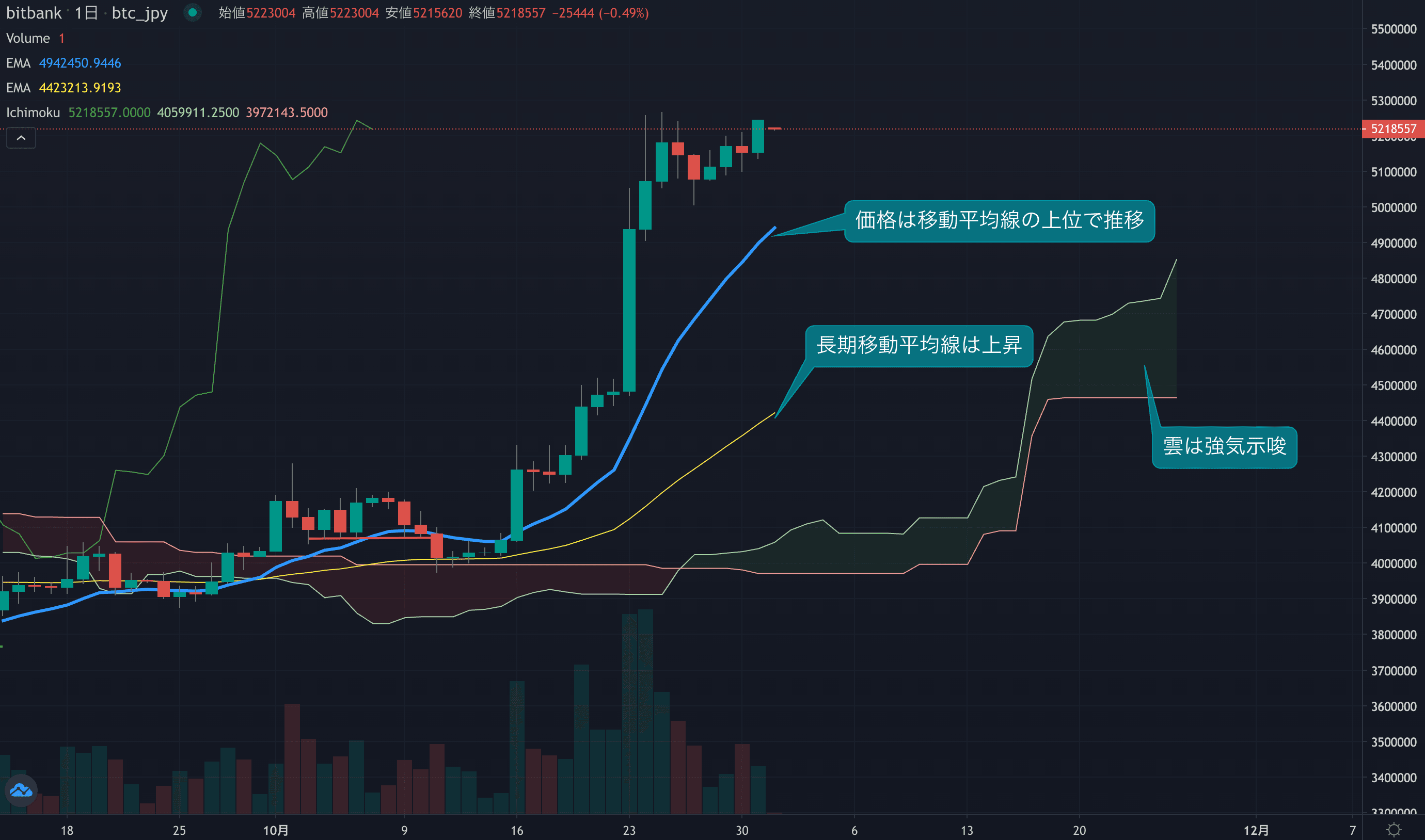 - 価格は14EMA(489.9万円)を上回り強気示唆です。53EMA(439.2万円)は上昇しており、長期トレンドも強気です。一目均衡表の雲は先行スパン1(474.4万円)が先行スパン2(446.5万円)を上回り強気示唆です。