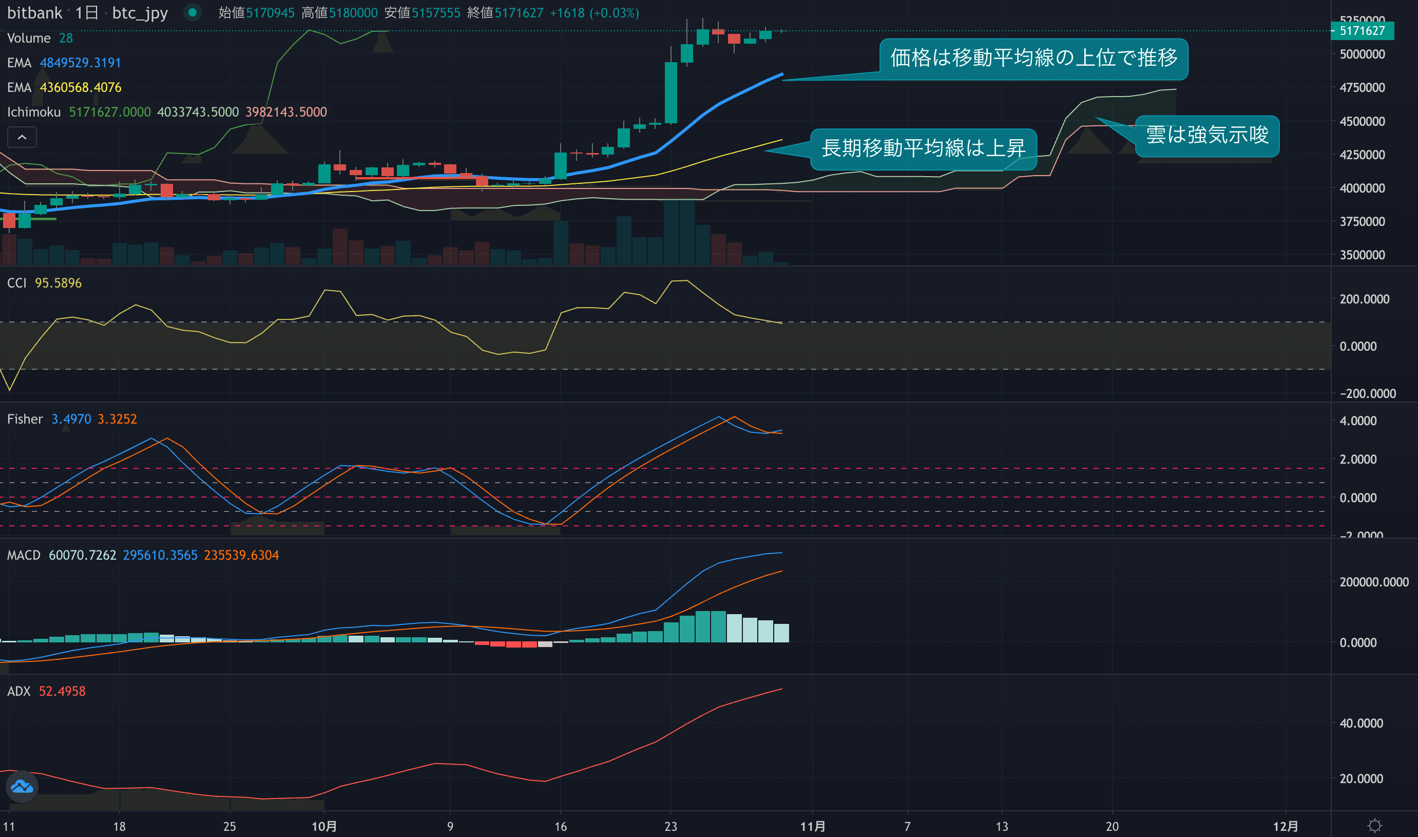 - 強気バイアス・シグナル:Fisher Transformがプラス圏で推移