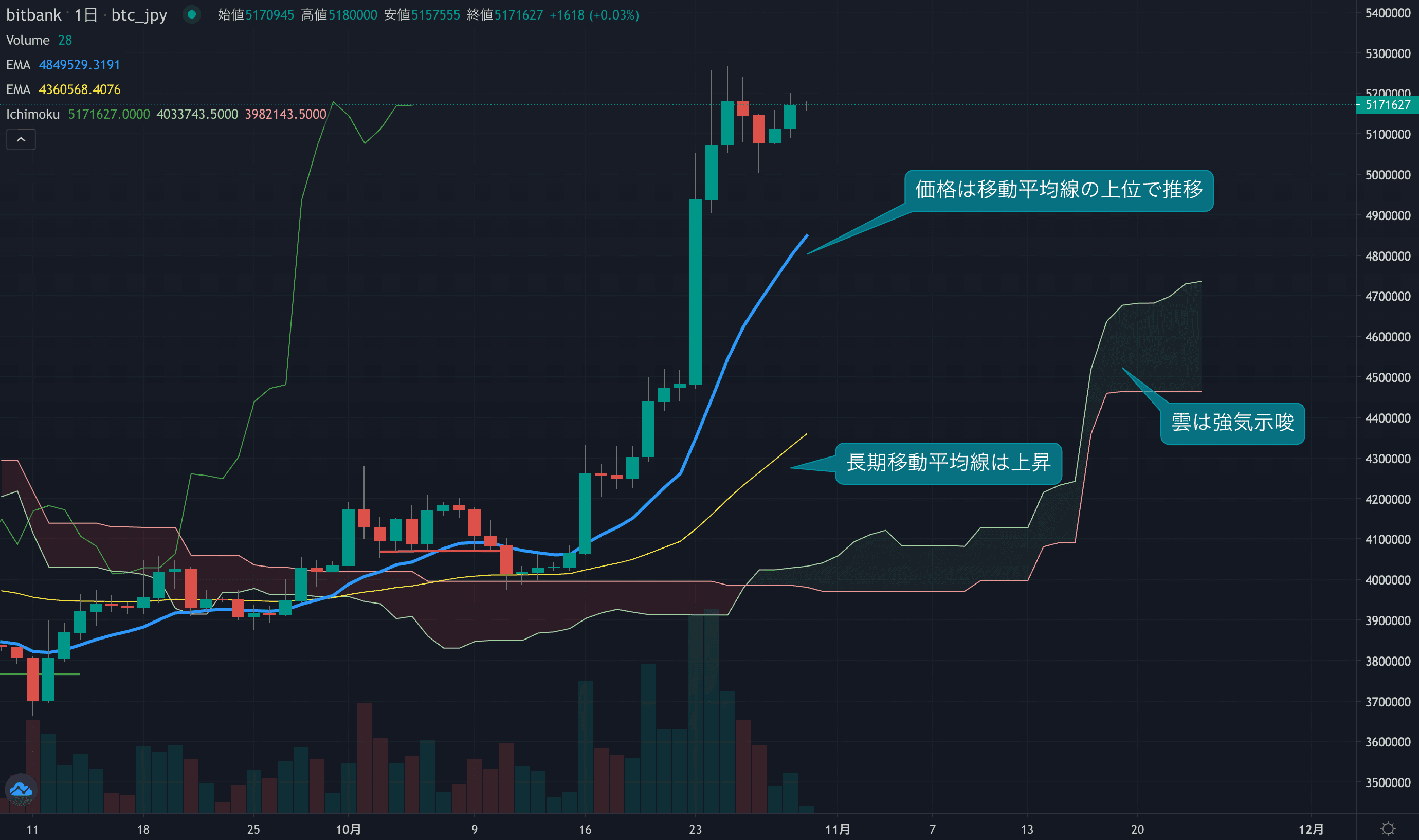 - 価格は14EMA(479.9万円)を上回り強気示唆です。53EMA(398.6万円)は上昇しており、長期トレンドも強気です。一目均衡表の雲は先行スパン1(483.0万円)が先行スパン2(446.5万円)を上回り強気示唆です。