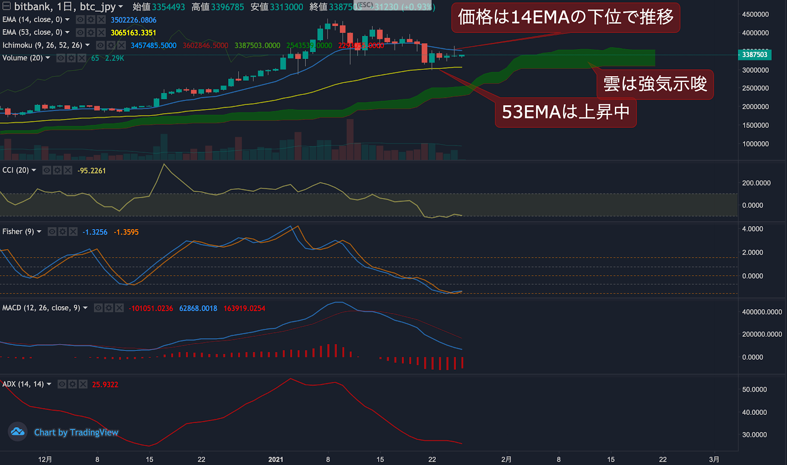 1月25日のビットコインの日足終値は移動平均線を下回り弱気トレンドを示唆し、オシレーターのCCIとFisherがマイナス域で推移しておりこれをコンファームしています。