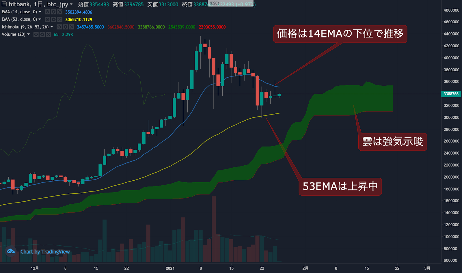 昨日のビットコイン(BTC)の日足終値は、前日から0.1%上昇した335.6万円でした。価格は14EMA(351.9万円)を下回り弱気示唆です。53EMA(305.2万円)は上昇中で長期トレンドは強気です。一目均衡表の雲は先行スパン1(352.9万円)が先行スパン2(309.4万円)を上回り強気示唆です。