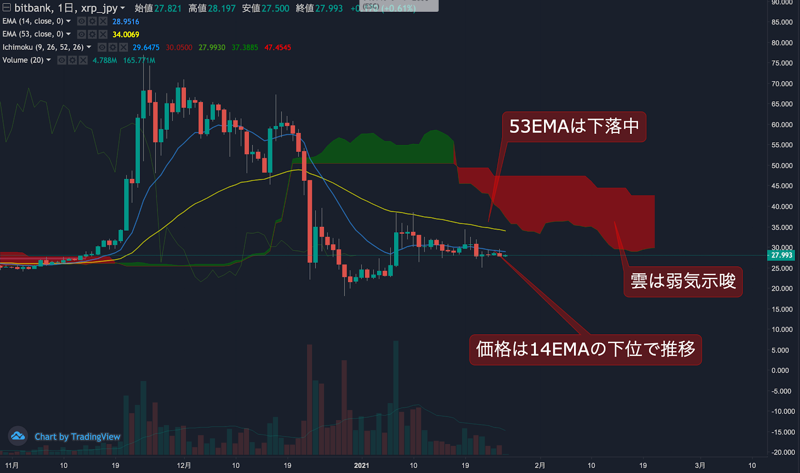 昨日のリップル(XRP)の日足終値は、前日から2.1%下落した27.8円でした。価格は14EMA(29.0円)を下回り弱気示唆です。53EMA(34.2円)は下落中で長期トレンドも弱気です。一目均衡表の雲は先行スパン1(29.6円)が先行スパン2(42.6円)を下回り弱気示唆です。