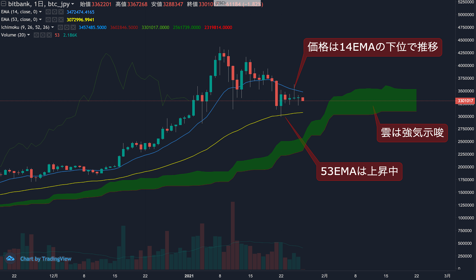 昨日のビットコイン(BTC)の日足終値は、前日から0.1%上昇した336.2万円でした。価格は14EMA(329.8万円)を下回り弱気示唆です。53EMA(306.4万円)は上昇中で長期トレンドは強気です。一目均衡表の雲は先行スパン1(353.0万円)が先行スパン2(309.4万円)を上回り強気示唆です。