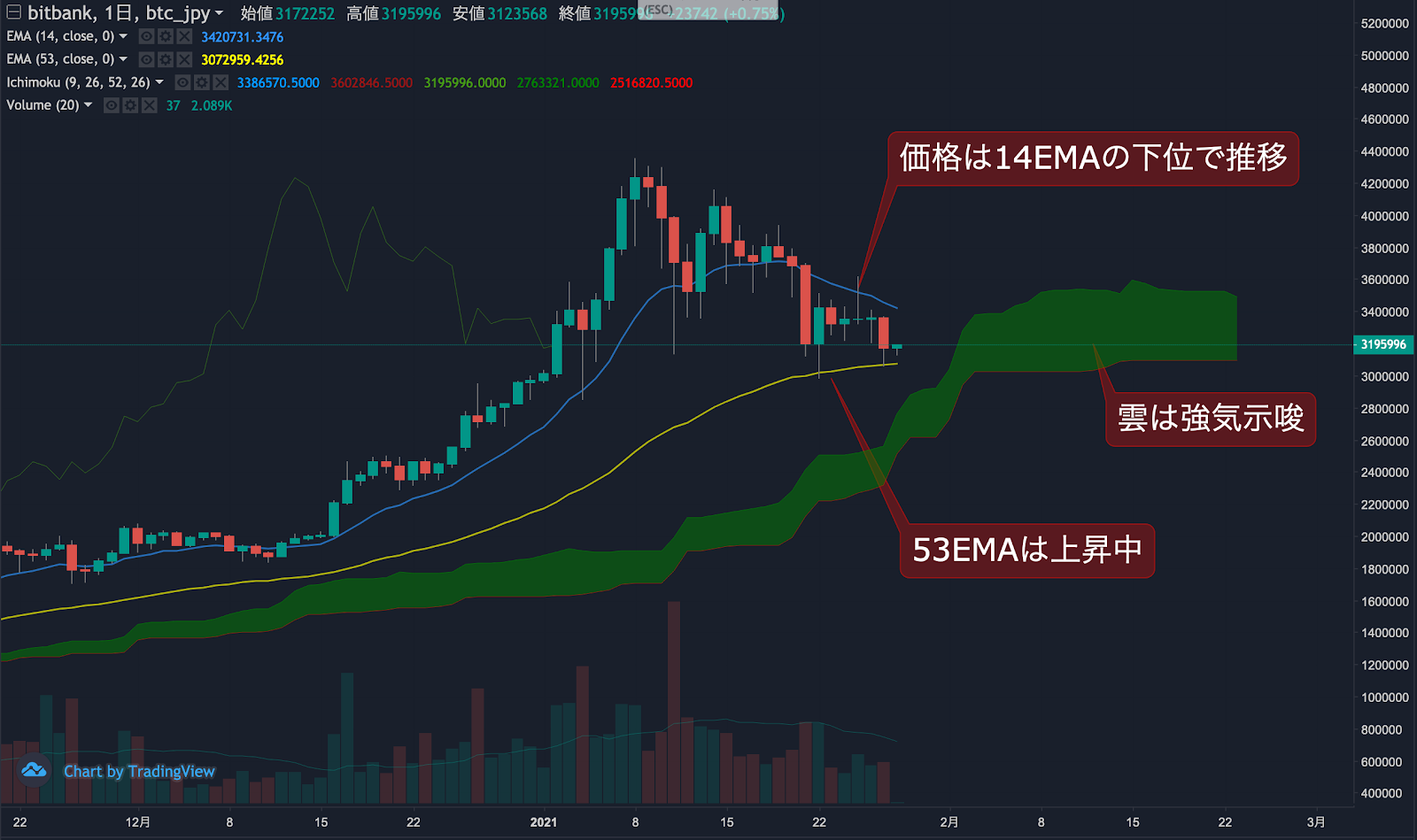 昨日のビットコイン(BTC)の日足終値は、前日から5.6%上昇した317.2万円でした。価格は14EMA(345.5万円)を下回り弱気示唆です。53EMA(306.8万円)は上昇中で長期トレンドは強気です。一目均衡表の雲は先行スパン1(353.0万円)が先行スパン2(309.4万円)を上回り強気示唆です。